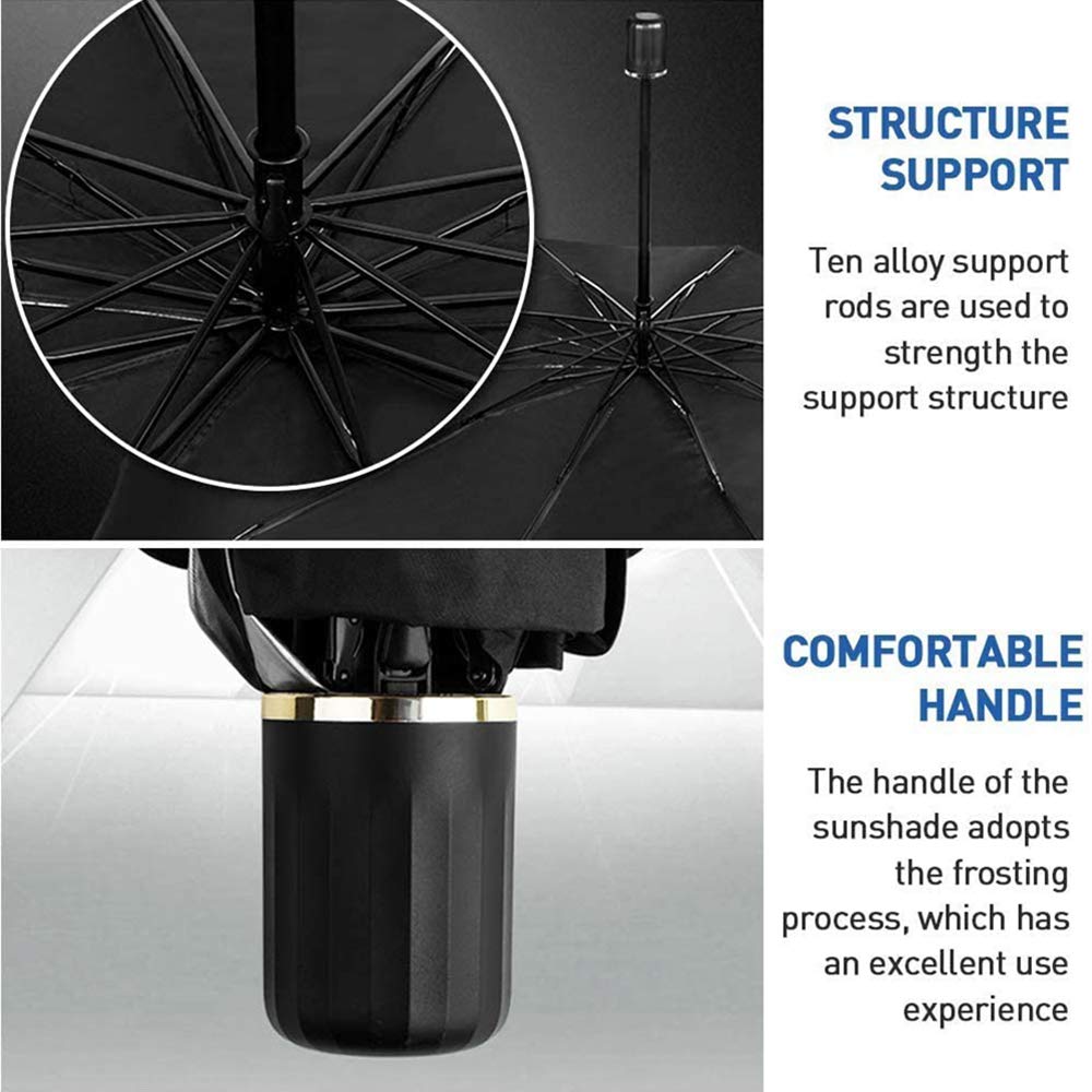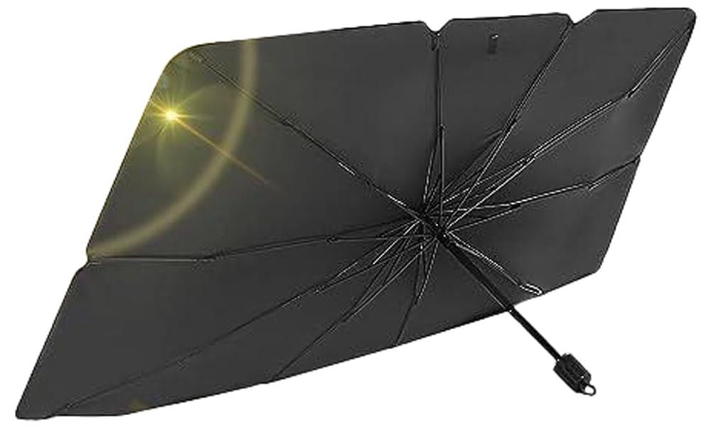 NEW DESIGN CAR WINDSHIELD SUN UMBRELLA Automotive windshield sunshade can effectively protect you from sunlight and provide you with a cool driving environment, keep the seats and dashboard from cracking due to sun exposure. Product Features: Composite titanium silver glue material:With strong heat insulation ability, high refractive index, UPF50 + Easy to Use and Store: Easily store under the seat or in the trunk. Protect car display: Install the packaging bag to protect your center console and avoid screen scratches. Umbrella design: No need to install, can be opened and used after parking. Multiple usage scenarios:It can not only be used to prevent scorching sun in Summer, but is also suitable and helpful in all seasons and harsh weather, like heavy snowy or rainy weather. Protect Privacy:With this sunshade,you can be free in your car! Specification: Color: silver Material: silver coated cloth + bracket Product package : 1 x car sun umbrella + 1 x High-grade leather case Product expansion size : 57inch * 31inch Product storage completed size : 12.6 inches * 2.7 inches * 2.6 inches NOTE : Please confirm your car windshield size suitable before buying.