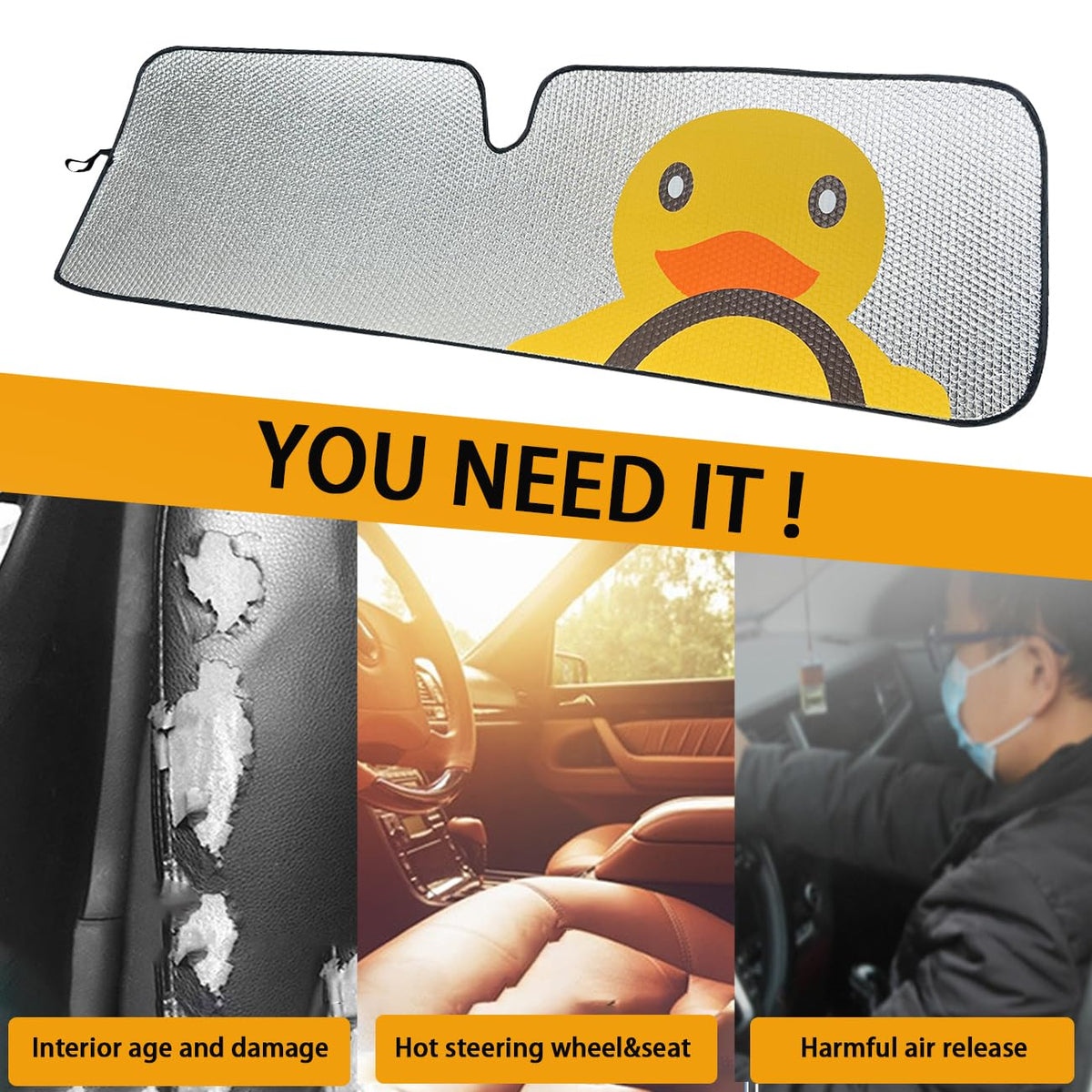 The windshield sun shade for Jeep effectively reflects direct sunlight, reducing heat and keeping the car's interior cooler.while guarding the instrument panel to minimize fading and heat damage. Fitment: -For Jeep Wrangler TJ JK JK JL &Gladiator JT 2 Door & 4 Door. Features: -Material:This Windshield Sun Shade made Special Metalized Polyester film-laminated to a thin layer of closed-cell foam. -Faunction:Effectively block the direct sunlight from ultraviolet rays into the car and dashboard to reduce the temperature inside the car and keep the car cool. -Installation:Easy Installation,no tools required and no need for any modifications. Name:Windshield Sunshade for Jeep Wrangler Package included: 1 x Windshield Sun Shade The windshield sun shade for Jeep is printed with a duck pattern, which will bring a fun experience every time you use it!