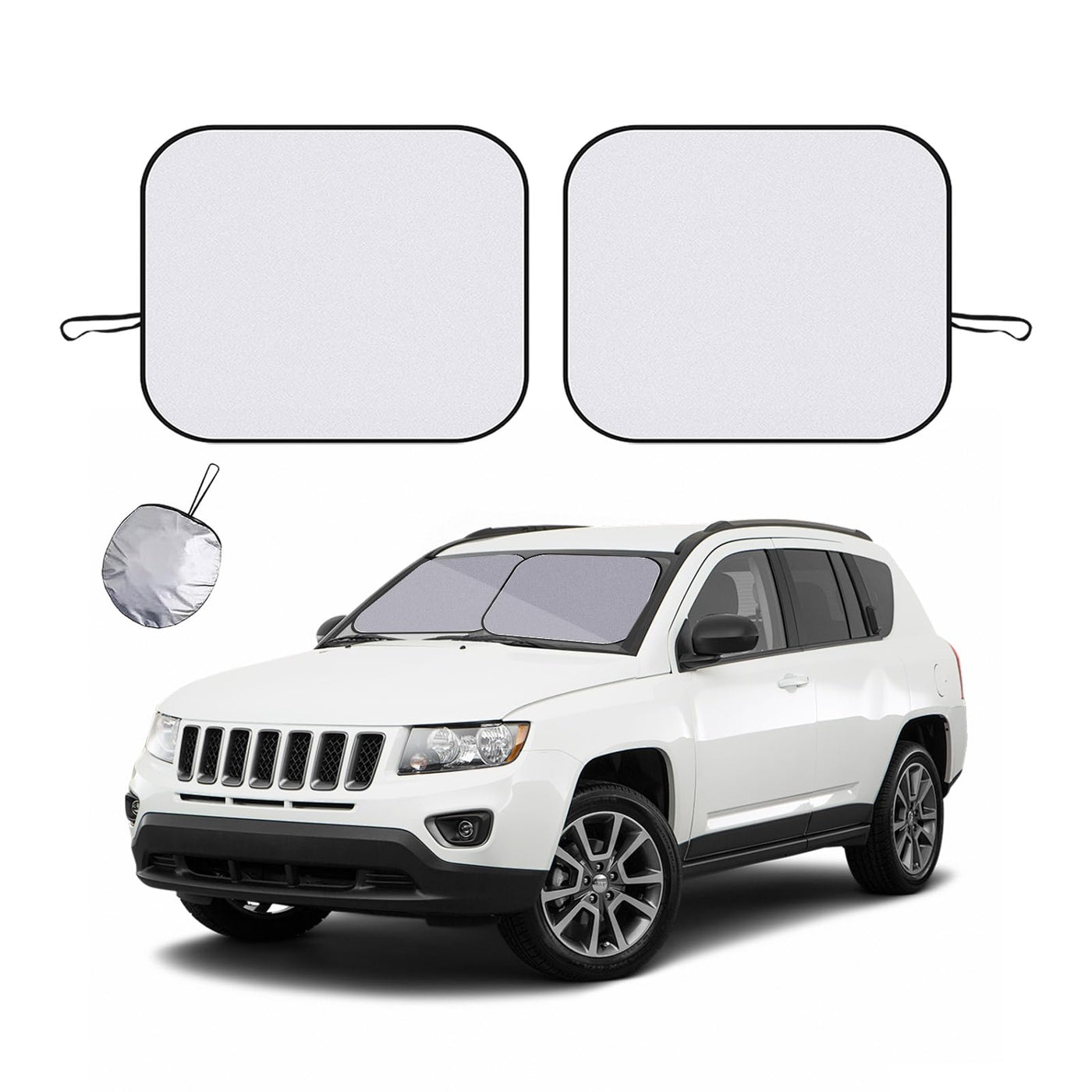 Product Information: Size: 28 31inch Weight: 17g Material: Polyester Quantity: 2 Pcs Closure Type: Foldable Vehicle Service Type: Universal Fit Why use a car windshield sun shade in summer? Have you ever opened your car door and been tortured by the heat inside? Sitting in a hot leather seat, trying to drive with your hands on a hot steering wheel? Ever feel your family in the heat in the back seat? -Yes, that's why you should use a car windshield sun shade. If you've been searching for the best sun visor to protect your vehicle from dangerous UV, summer heat and the sun rays. -Look no further, we are ready for you!