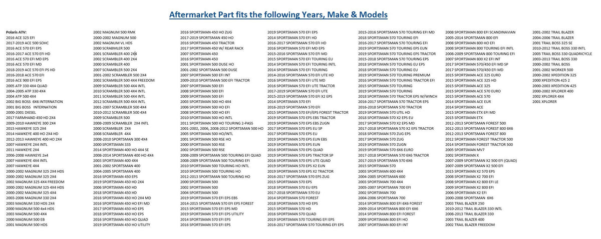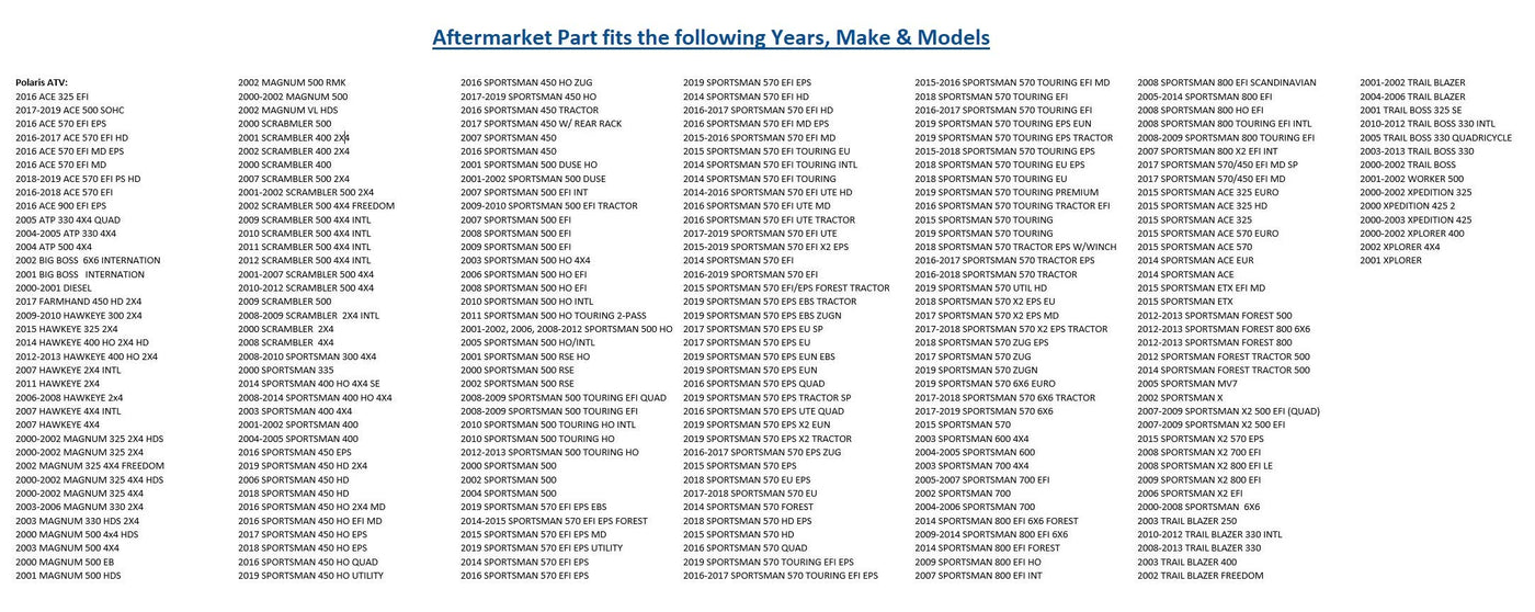 Q: How do I know if this replacement kit is suitable for my Polaris ATV or UTV?A: To determine if this replacement kit is suitable for your Polaris ATV or UTV, check the compatibility list in the product description and compare your model's specifications with the mentioned years and part numbers.