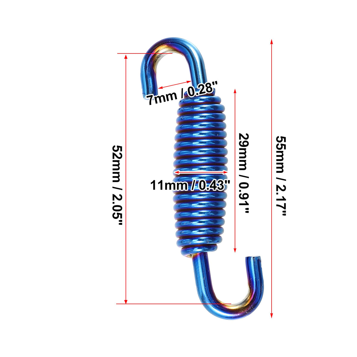 Specification: Material: 304 Stainless Steel Color: Blue Total Length: 55Mm / 2.17&Quot; Spring Length: 29Mm / 0.91&Quot; Spring Diameter: 11Mm / 0.43&Quot; Hook Inner Width: 7Mm / 0.28&Quot; Installation Spacing Length: 52Mm / 2.05&Quot;