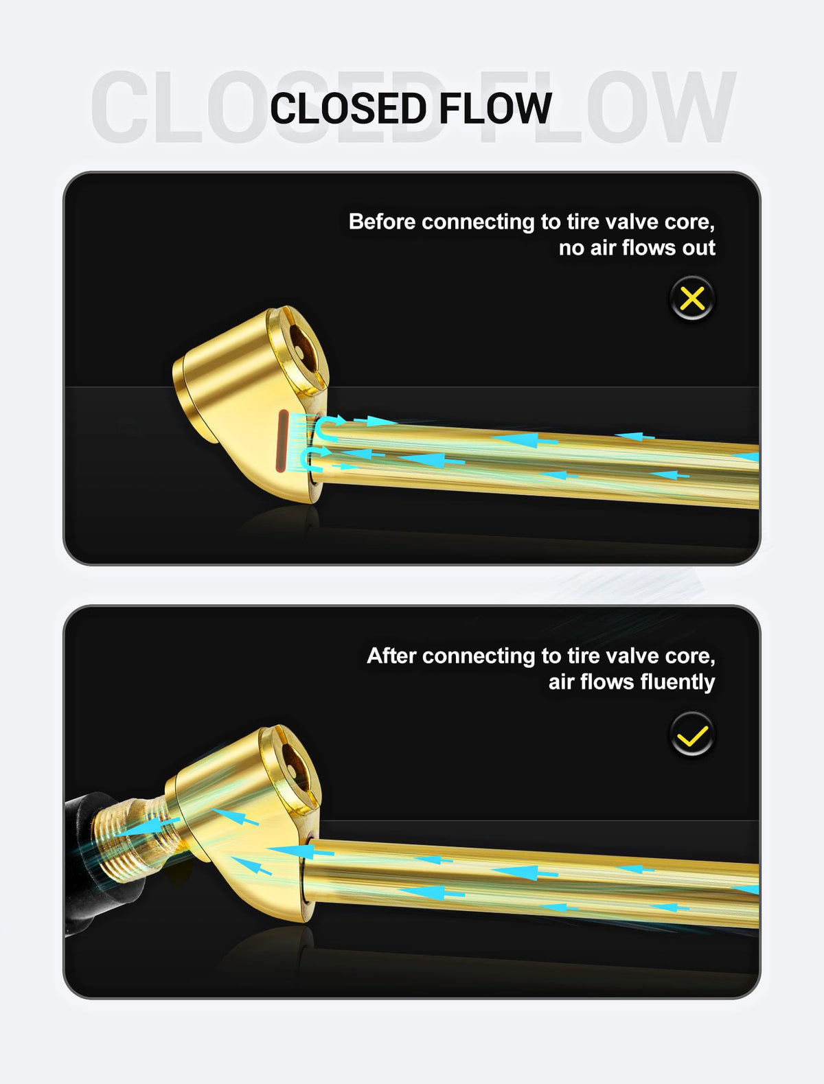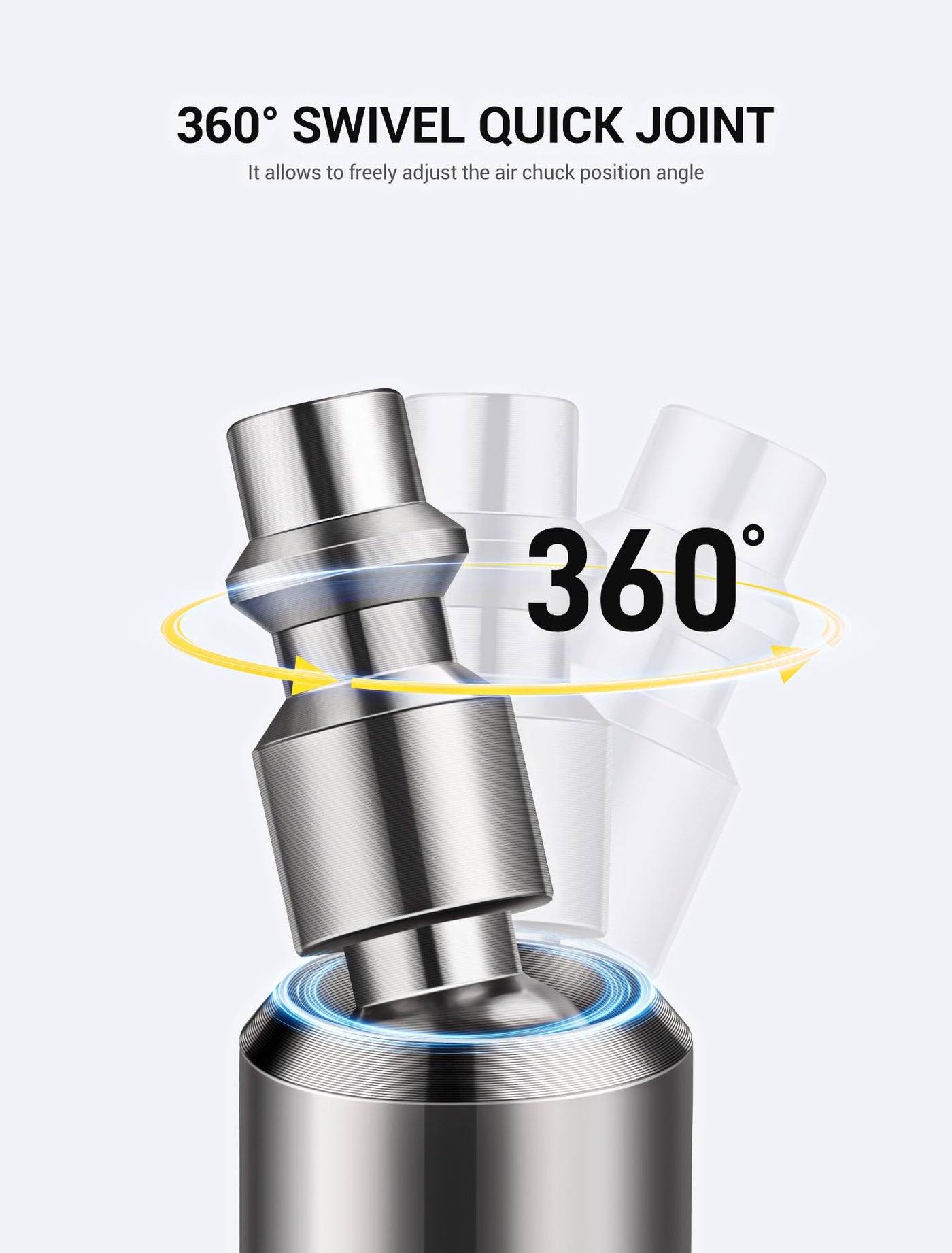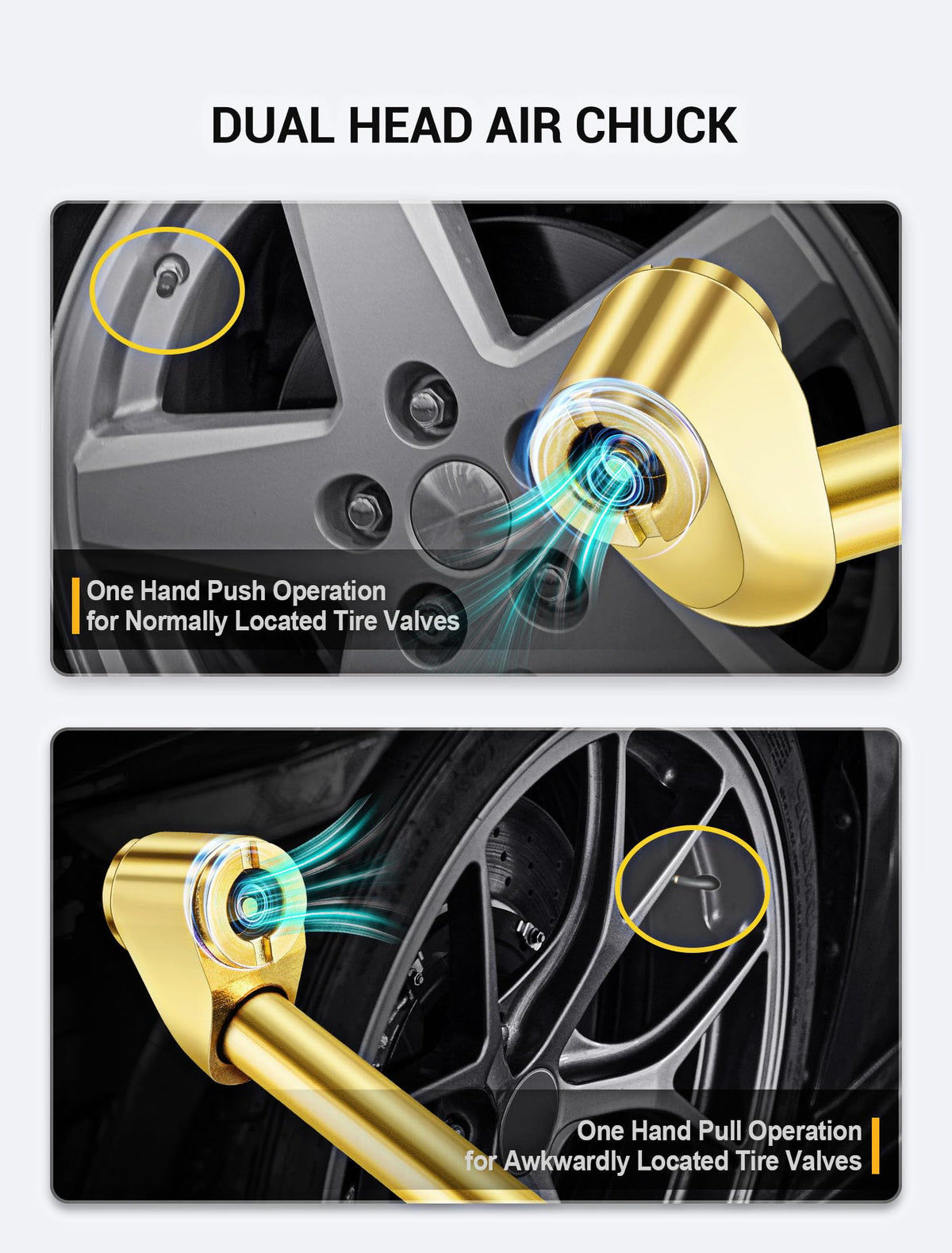 5-pack 360 Swivel Dual Head Air Chuck Kit, 1/4'' Female NPT Closed Ball Tire Chuck with Standard Brass Quick Plug,2-Way Connection Tire Air Fill Kit for Tire Inflator Gauge and Air air compressor ?Package Includes?: The package contains 1 pcs dual head closed flow air chuck, 1 pcs ball head air chuck, 1 pcs male quick plug/fitting, 1 pcs 360 Swivel Quick Plug, 1pcs teflon tape. ?360 Swivel Quick Plug?: 360 swivel standard male connector can be rotated flexibly to increase mobility and reduce the burden on your wrist and air hose, ideal for pneumatic tools. It is also equipped with waterproof Teflon tape to reduce thread clearance and prevent air leakage. ?2-way Easy Connection?: Both air chucks featured a female 1/4''NPT thread for easily connected to air lines, air compressor or tire inflator gauges for tire inflation. Also included two standard 1/4'' male quick plugs, for easy and swiftly connecting to air lines' female quick couple. ?STRONG AND DURABLE?: Constructed with high quality metal alloy and beass, higher strength and durability, corrosion resistance and wear resistance, which is a perfect choice no matter for business or household use, will serve you faithfully for years. ?Widely Applicable?Maximum endurance pressure is up to 250PSI, ideal for conveniently inflating tires with schrader valve, widely applicable for various vehicles, bikes, motorcycle, car, truck, air compressor accessories, etc.