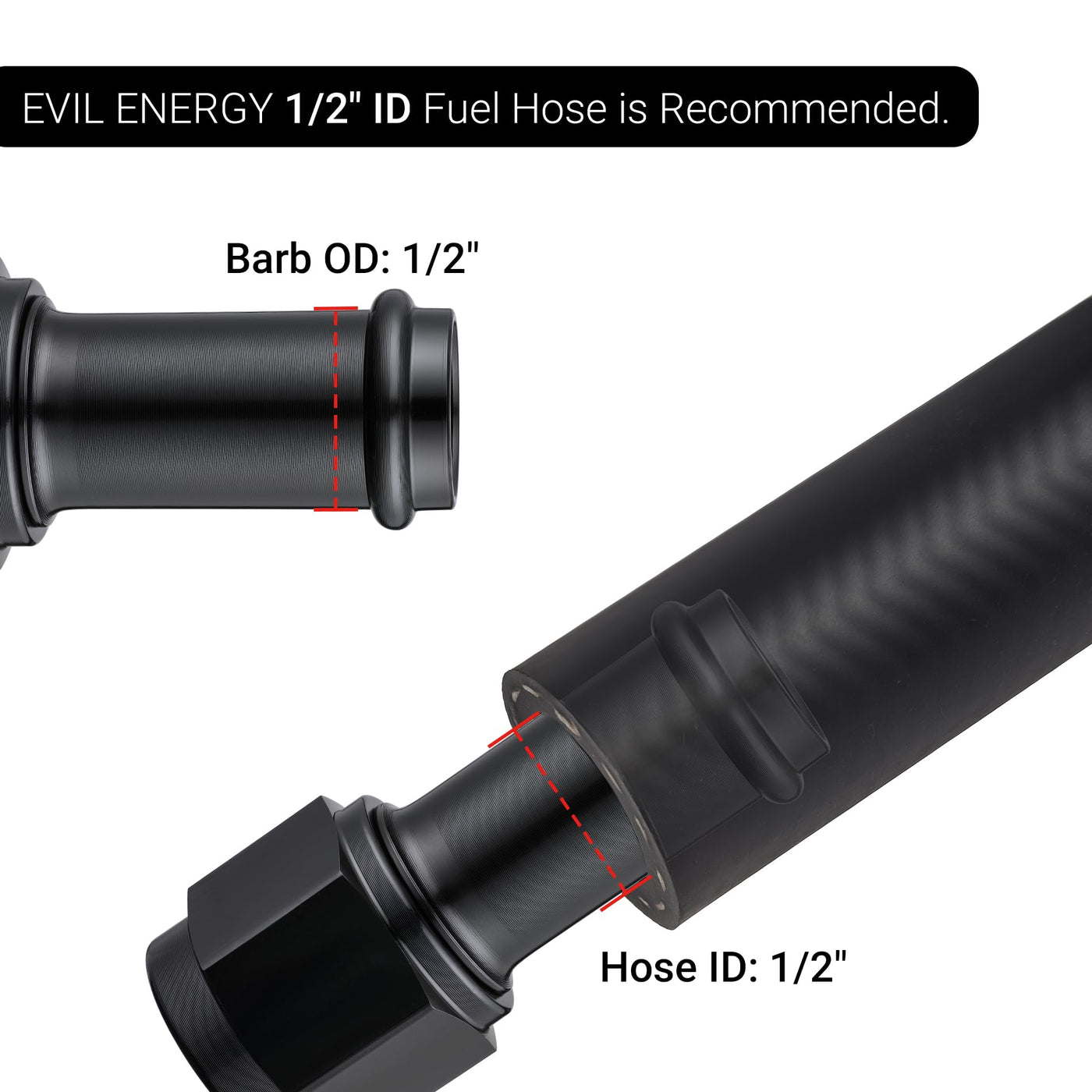 EVIL ENERGY is our brand, we're a direct and professional manufacturer, one of greatest manufacturer and exporter in tuning parts include intake system, exhaust system, fuel system, cooling system, interior and exterior parts. The 6an to 1/2 inch barb is used for pipe link, widely used in fuel system. The barb fitting is made of aluminum alloy 6061-T6 with a black anodized finish. Note: When installing fittings, it is recommended to use clamps to ensure sealing.