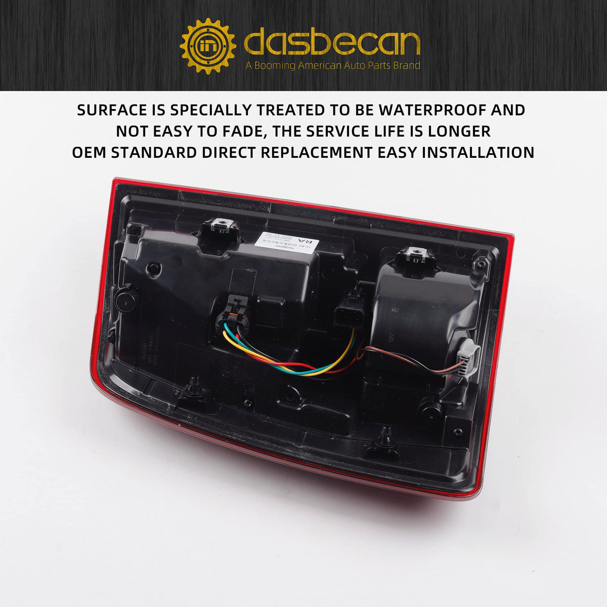 Q: What color is the Dasbecan Tail Light Assembly?A: The Dasbecan Tail Light Assembly features a black interior with a red lens, providing a sleek look while ensuring visibility. This design is tailored to match the aesthetics of the Dodge RAM models it is compatible with.