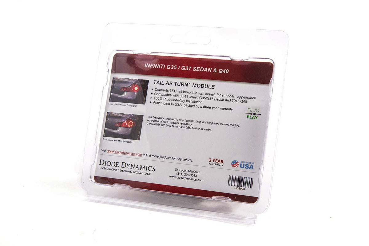 Custom Appearance This Kit Will Convert The Led Tail Light On Your 2009-2014 Infiniti G37 Sedan To Also Function As The Turn Signal This Kit Will Instantly Customize Your Vehicle For A Much More Modern Appearance On The Road! This Module Does Not Include The Option To Convert Your Old Turn Signal Location Into Additional Backup Lights Easy Installation Using Oem Tail Light Connectors The Base Kit Is 100 Percent Plug-And-Play And Installs In Minutes With No Wiring Required You Don'T Even Have To Remove Your Tail Lights! Experience After Over A Decade In Business Diode Dynamics Is The Most Trusted Name In Automotive Led Lighting Unlike Every Other Led Distributor We Manufacture And Engineer Products Ourselves In The United States For High Quality And Fast Time-To-Market Of The Newest And Brightest Led Technologies We Pride Ourselves In Offering Only Quality Led Products That Will Exceed Your Expectations Features Converts Your Tail Light To Also Function As The Turn Signal Oem Tail Light Connectors For Simple Plug-And-Play Installation Made In Usa What'S Included In The Box Two (2) Modules For Installation On 2009-2014 Infiniti G37 Sedan One (1) Installation Guide Quantity Pair (Left And Right Side) 3 Year Return Policy 30-Day Return With No Restocking Fee 100 Percent Satisfaction Fitment Note This Module Is Compatible With Sedan Models Only Application Rear Turn Signal Tail Light Make Infiniti Model G37 Sedan Years 2009 2010 2011 2012 2013 2014 Electrical Compatibility No Electrical Issues (Tested And Confirmed) Specifications Operating Voltage 9-16V Operating Temperature -40C To 85C (-40F To 185F) Connector(S) Oem-Size Plug And Play.