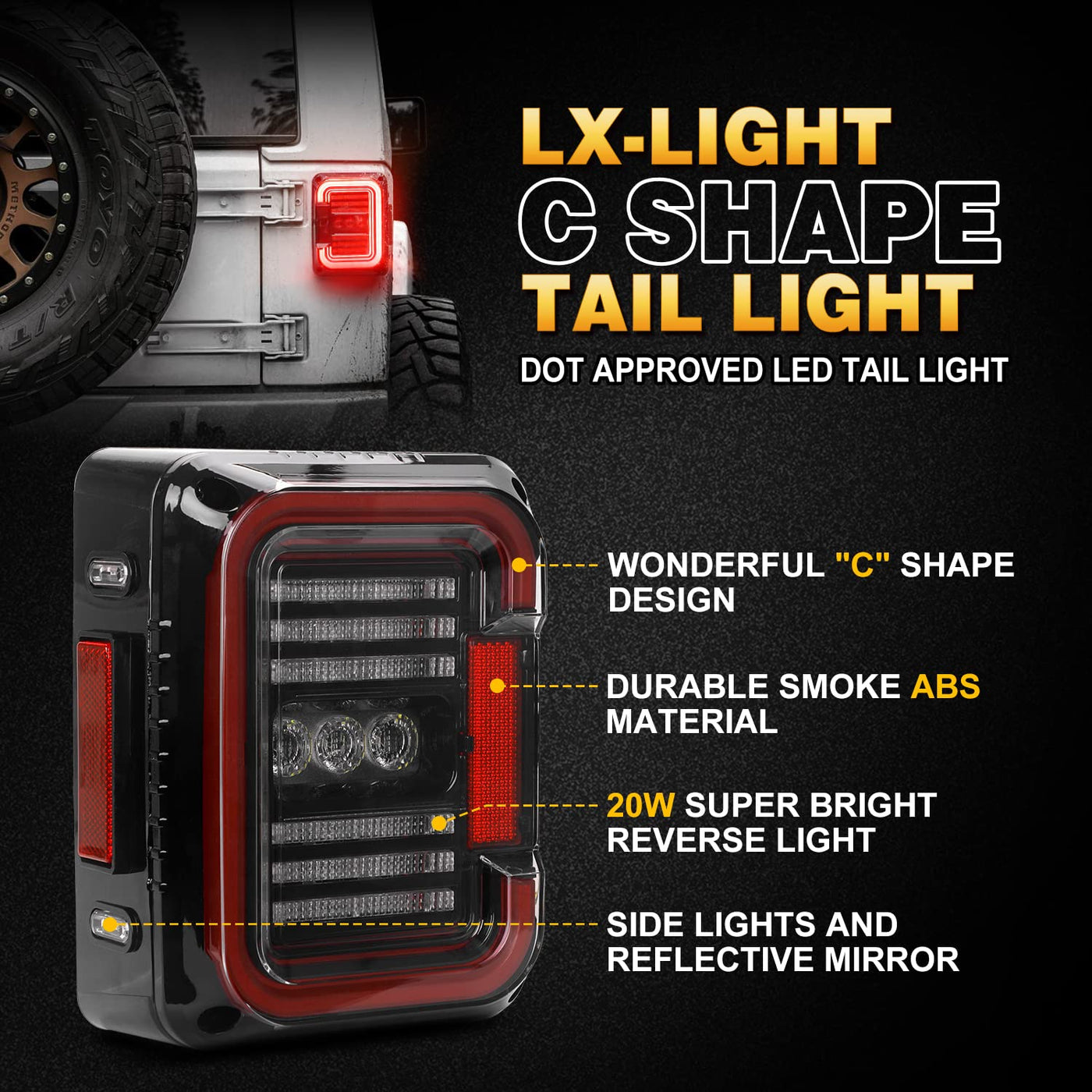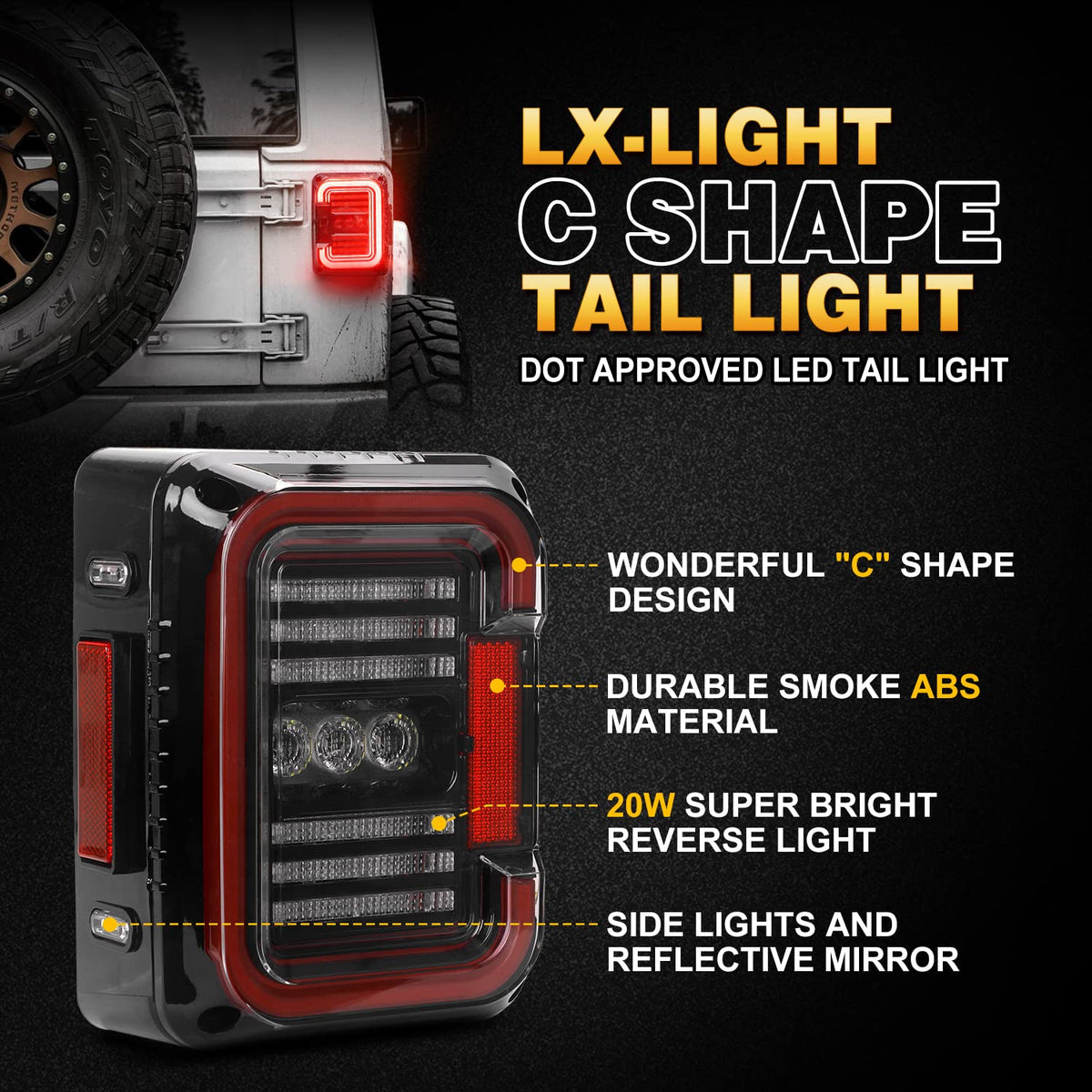 Simple installation - Plug & Play, Usually in 5-10 minutes.These new tail lights are extremely bright in reverse, running light and brake light, with 20W high power reverse light, more spot and safe. | LX-LIGHT Fantastic Design- DOT approved LED Tail Light compatible with jeep jk,jku, Maintenance Free, Water-proof IP67 | EMC BUILD IN- Solved the flicker issue,no need add load resistors anymore and easy to install compare with the old model. | Fitment- Compatible with Jeep Wrangler JK 2 Door, compatible with Jeep Wrangler Unlimited JK 4 Door(only usa version jeep,not fit eu version jeep) | Package Included- 2pcs wrangler JK tail light+1 installation guide.
