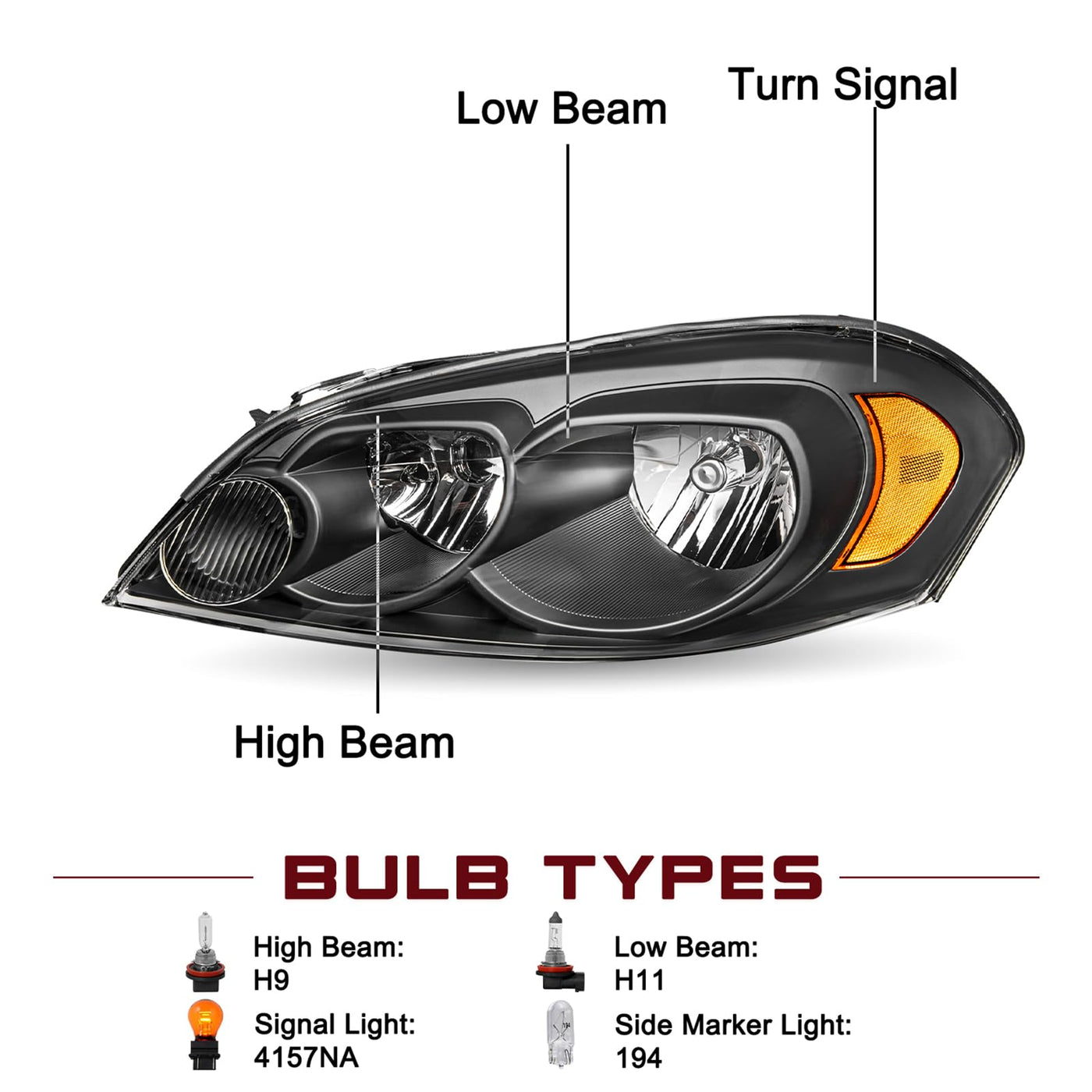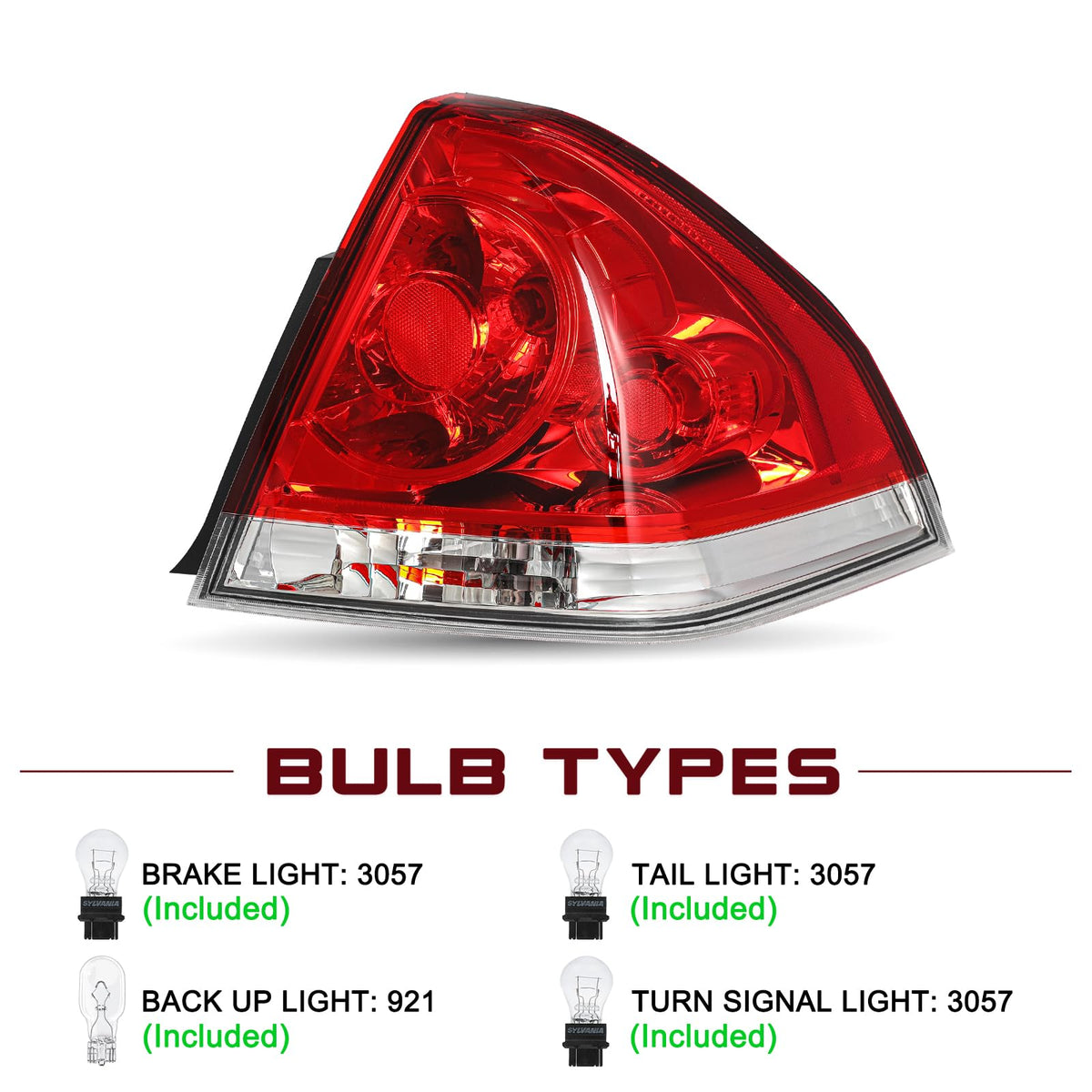 ???VEHICLE COMPATIBILITY?Headlights Assembly Compatible with 2006-2013 Chevrolet Impala, 2014-2016 Chevrolet Impala Limited, 2006-2007 Monte Carlo. High beam bulb type: H9 (NOT Included); low beam bulb type: H11 (NOT Included). Signal light: 4157NA (Not Included); side marker light: 194 (Not Included). OEM Part Number: 25958359 , 25958360. Partslink Number#: GM2502261, GM2503261. | ???VEHICLE COMPATIBILITY?Taillight assembly is compatible with 2006 2007 2008 2009 2010 2011 2012 2013 Chevy Impala, 2014 2015 2016 Chevy Impala Limited [4-Door Sedan] MODEL. Compatible on 2014-2016 Impala Limited Models ONLY. Bulbs Information: BRAKE LIGHT:3057(INCLUDED), TAIL LIGHT:3057(INCLUDED), TURN SIGNAL LIGHT:3057(INCLUDED), BACK UP LIGHT:921(INCLUDED). | ???SAFETY & DURABILITY?Made of good materials that meet or exceed OEM requirements. Micro-prism reflectors and chrome finishes within the headlights increase the light's reflectivity, making it easier for oncoming vehicles to notice you at night. Give you a safer comfortable driving experience. Stable characteristics and high reliability. | ???EASY INSTALLATION?Plug-n-play installation. Direct Bolt-On OE Fitment or Replacement for the Stock Unit; Requires No Modification or Drilling. Installation instruction is not included.