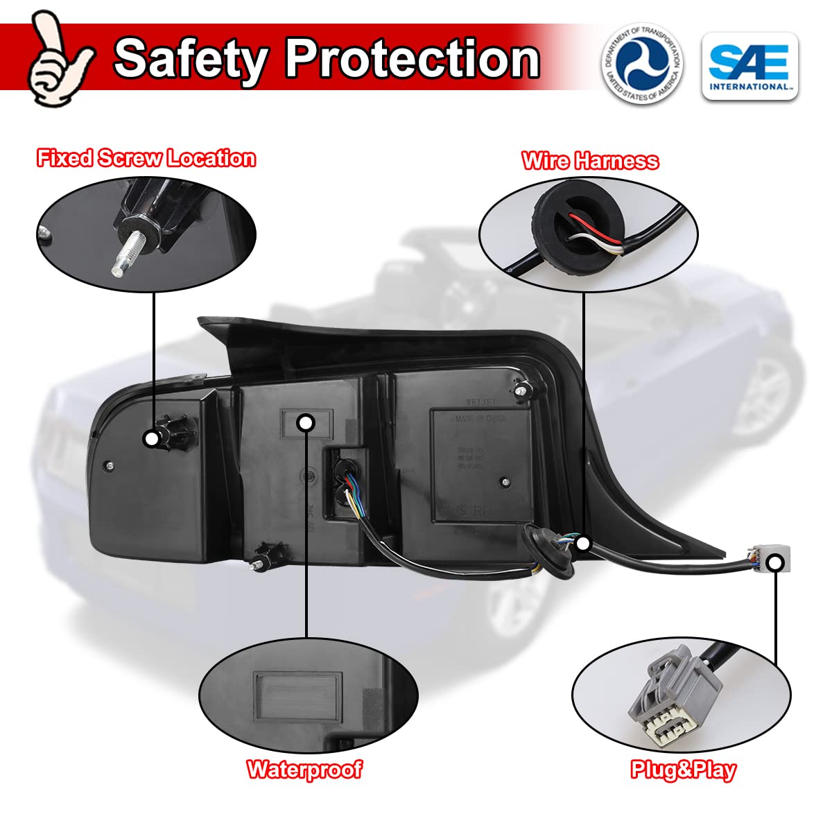 Q: What makes these tail lights a stylish choice for my Ford Mustang?A: These tail lights feature a unique design and lighting effects that enhance the aesthetics of your Ford Mustang. They not only improve driving safety but also help make your vehicle more eye-catching, reflecting your personal style.