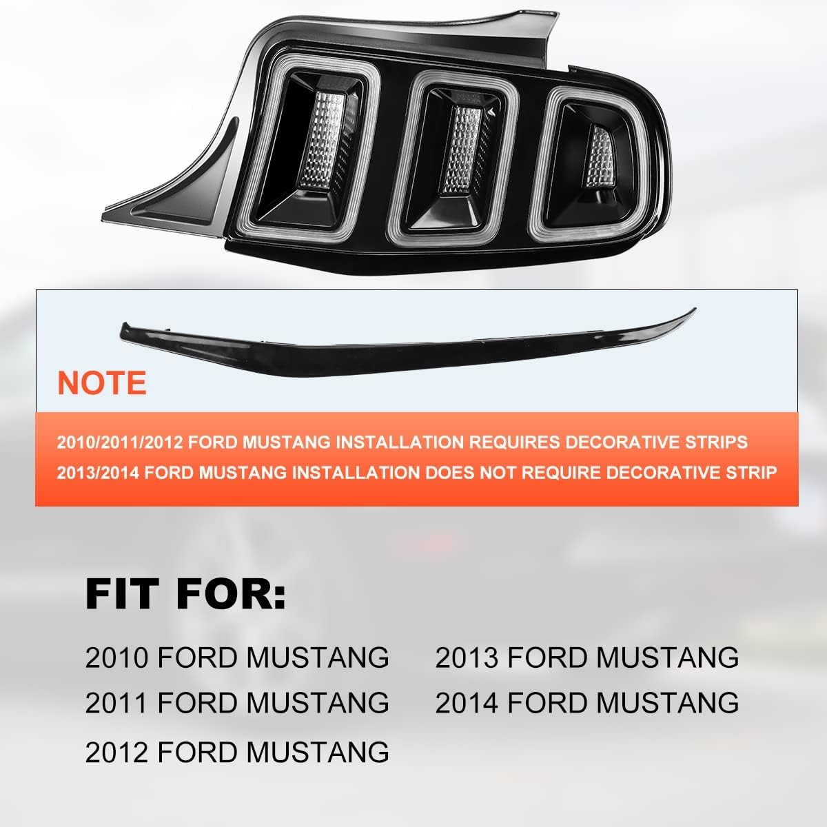 Q: Are these tail lights compatible with all Ford Mustang models from 2010 to 2014?A: The Nixon Offroad Tail Lights are designed for Ford Mustang models from 2010 to 2014. However, models from 2010 to 2012 require matching trim strips for proper installation, while models from 2013 to 2014 do not need trim strips.