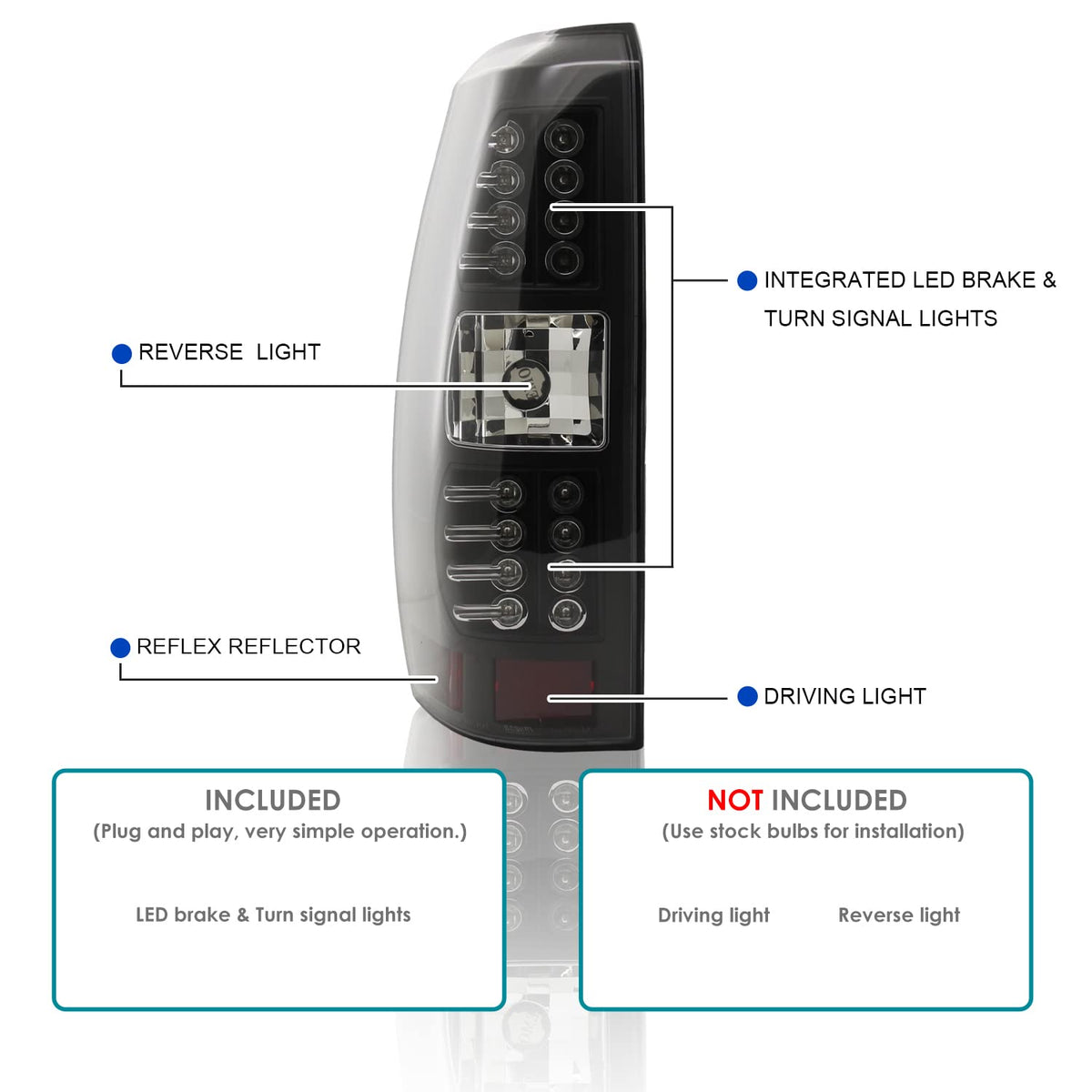 Q: Are these tail lights waterproof and resistant to damage?A: Yes, these tail lights undergo strict quality control to ensure they are fully sealed with solid silicon, making them waterproof. They are also impact and UV resistant, thanks to the polycarbonate lens and high-quality housing.