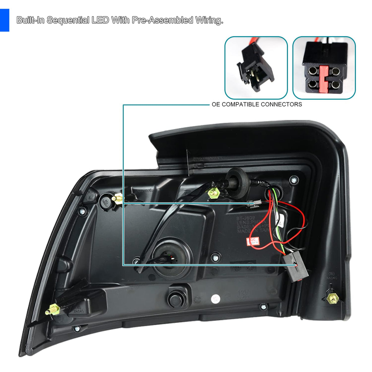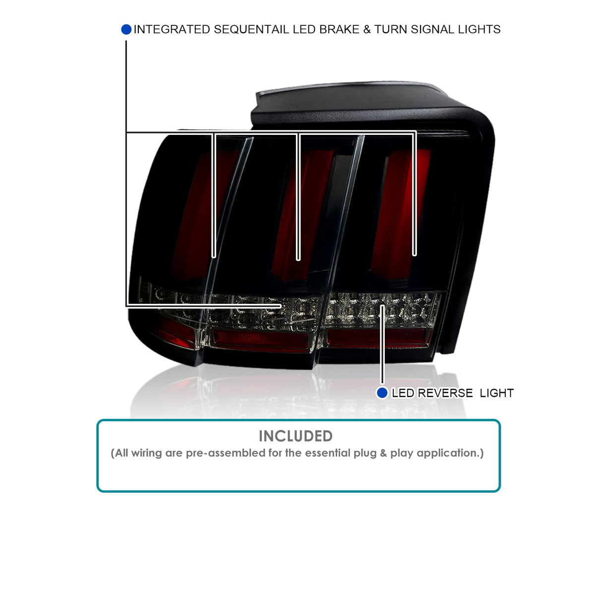 Q: What features make these tail lights a good choice for my Mustang?A: These tail lights offer a glossy black housing with a dark smoke lens, sequential LED functionality, and strict quality control to ensure they are waterproof and impact resistant, enhancing both style and safety.