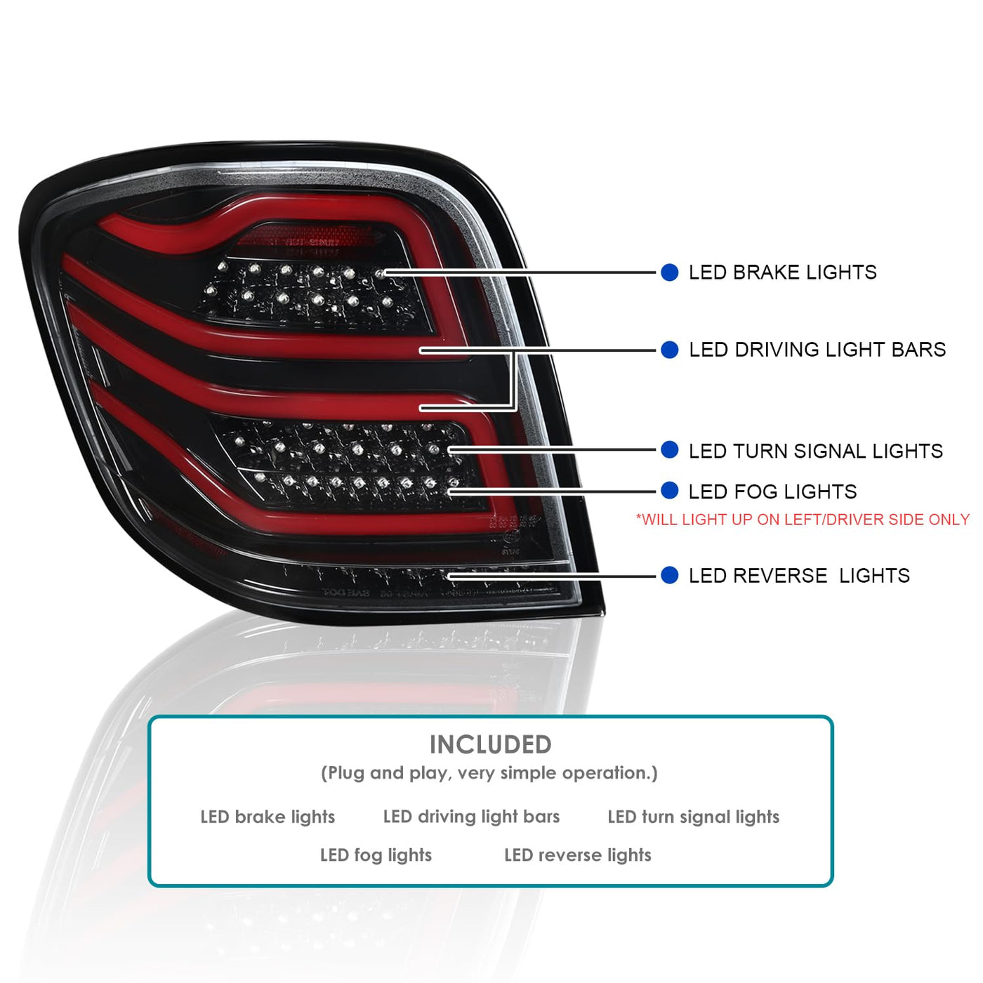 Q: What vehicles are compatible with the Spec-D Tuning Tail Lights?A: The Spec-D Tuning Jet Black Housing Clear Lens Red LED Bar Tail Lights are specifically designed to be compatible with 2006-2011 Mercedes-Benz W164 ML-Class models. Ensure your vehicle matches this specification for proper fitment.