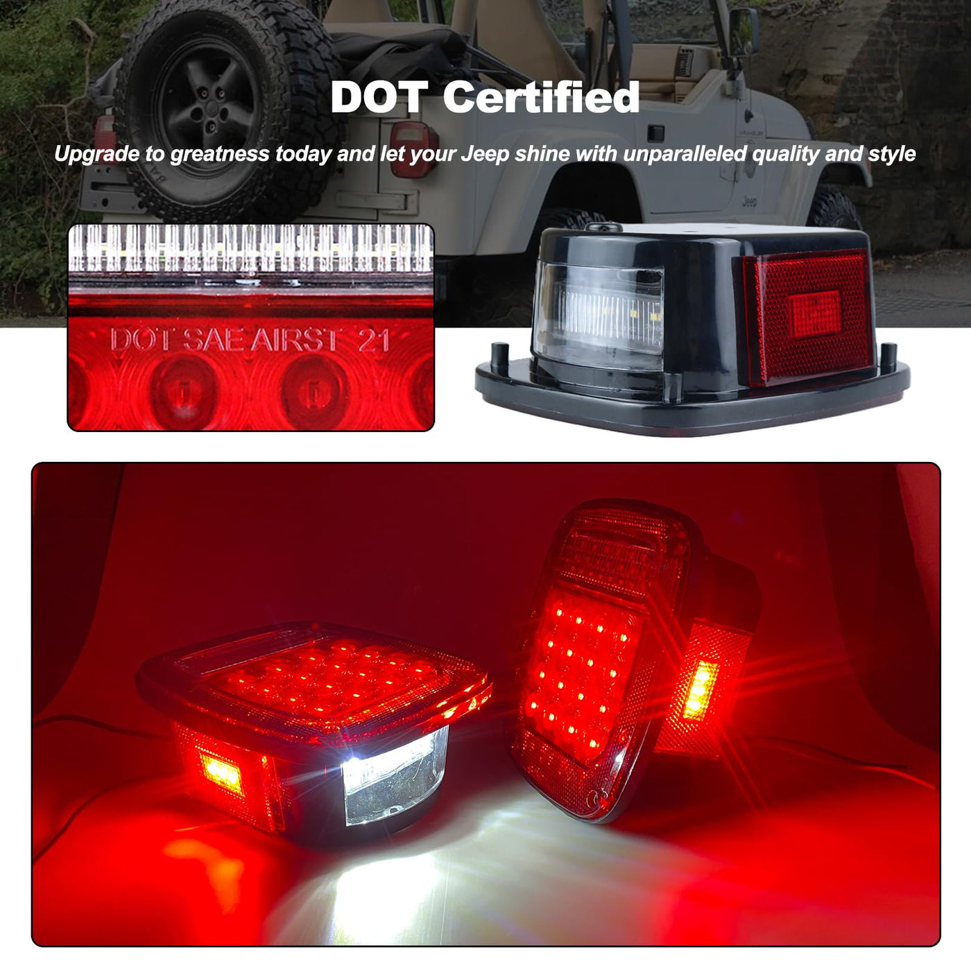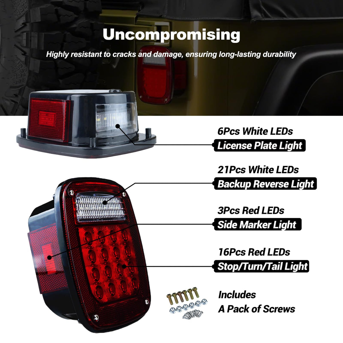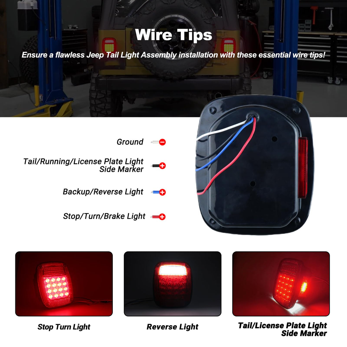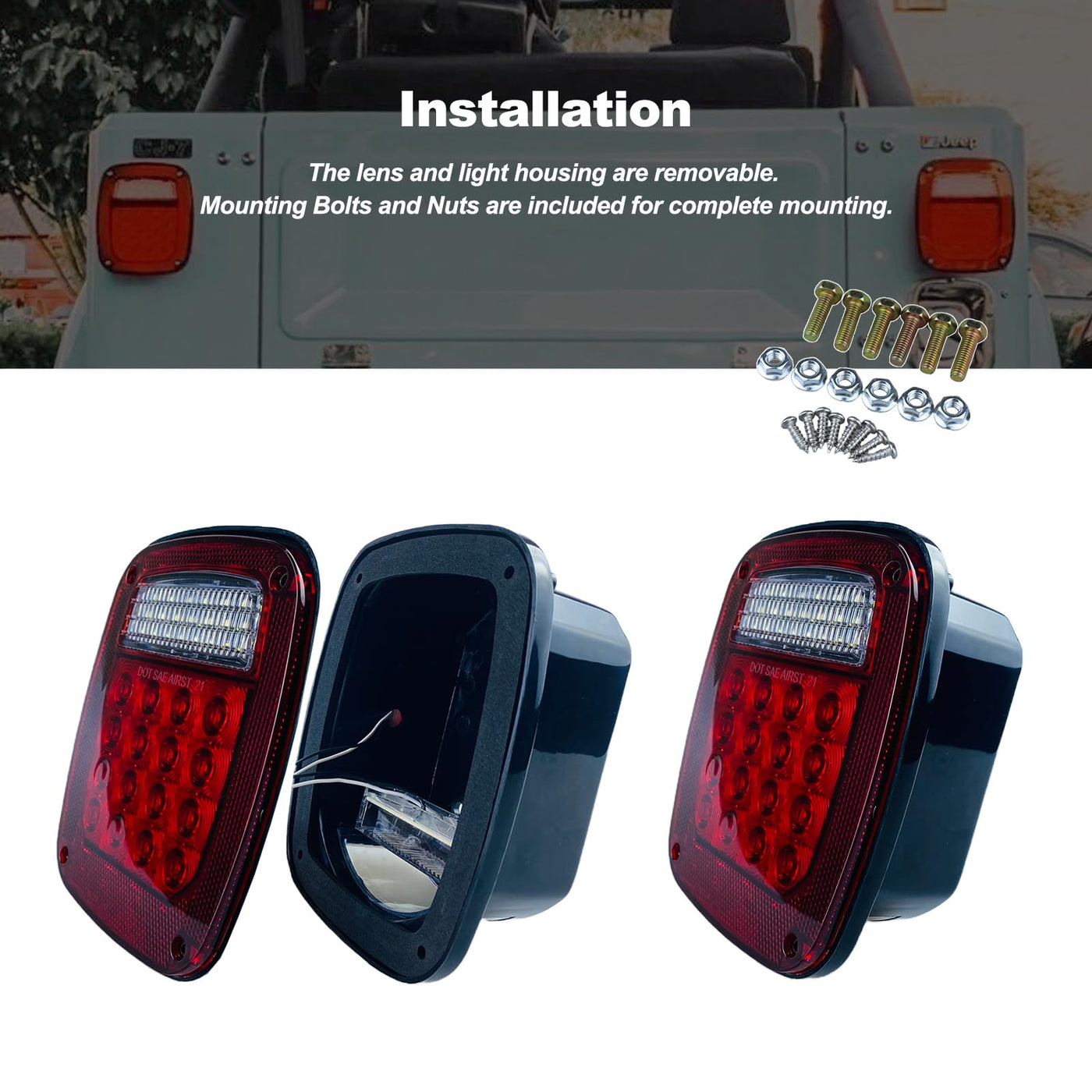 Package Including:2Pcs (Left + Right) Of Rear Tail Lights Assembly Upgrade Kit (With Mounting Screws, Bolts And Nuts Included)Compatibility:Replacement For 1976-1983 Cj5 Tail Lights Assemblyreplacement For 1976-1986 Cj7 Tail Lights Assemblyreplacement For 1981-1985 Cj8 Tail Lights Assemblyreplacement For 1987-1995 Wrangler Yj Tail Lights Assemblyreplacement For 1997-2006 Wrangler Tj Tail Lights Assemblyfeatures:Lens Color: Reddimension: 6.8'' X 5.7'' X 2.5''Waterproof: Ip65License Plate Light: 6Pcs Ledsbackup/Reverse Light: 21Pcs Ledsside Marker Light: 3Pcs Ledsstop/Turn Tail Lighjt: 16Pcs Ledswattage:License Plate Light: 0.5Wbackup/Reverse Light: 3.5Wside Marker Light: 0.5Wstop/Turn Tail Light: 2Wreplacement Oe Number:Left Side: 56018649, 56018649Ad, 56016721, Ch2800120, Ch2800161Right Side: 56018648, 56018648Ad, 56016720, Ch2801120, Ch2801161Wire Tips:White Line - Groundred Line - Stop/Turn/Brake Lighjtblack Line - License Plate Light+Side Marker+Tail Lightblue Line - Backup/Reverse Lightinstallation:The Lens And Light Housing Are Removable. Mounting Bolts And Nuts Are Included For Complete Mounting; These Rear Combination Tail Lights Are Bolt In Replacement Tail Lights And Bolt Directly In Place Of Your Stock Led Tail Lamps. You May Need To Cut Off The Stock Tail Lamp Pigtail And Spliced Onto The New Assembly With Included Hardware.