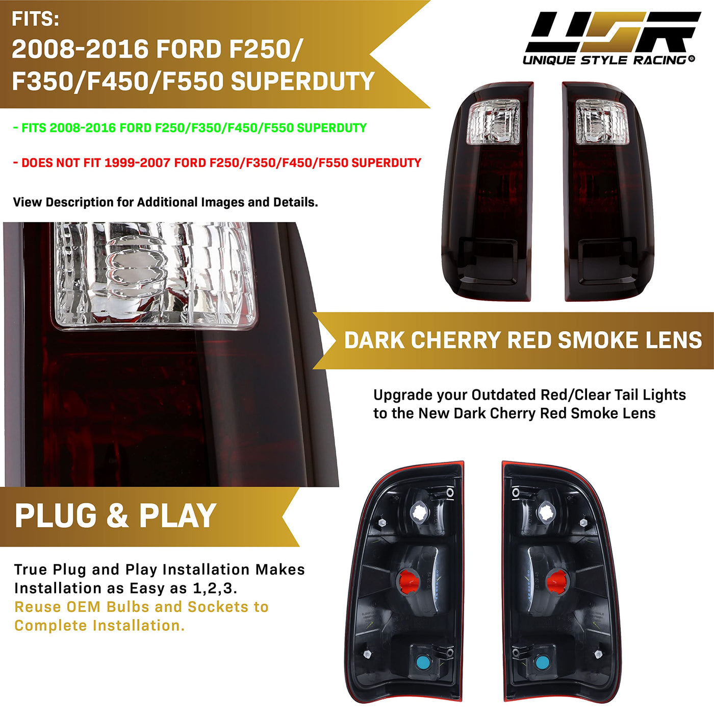 USR DEPO 08-16 Super Duty Dark Cherry Red Smoke Rear Tail Lights (Left + Right) Compatible with 2008-2016 Ford Super Duty F250 F