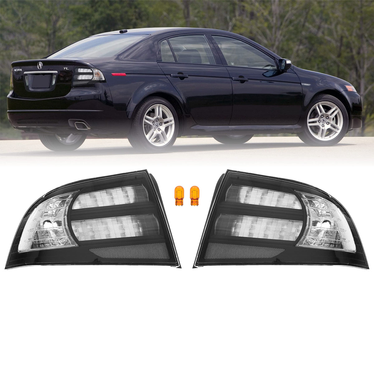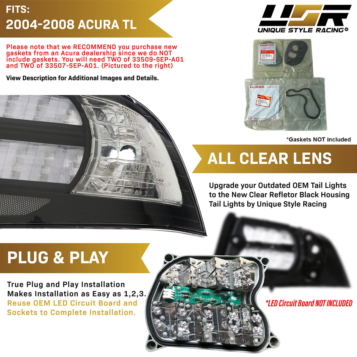 Unique Black Housing Clear Lens - Replace Your Outdated Oem All Red Design And Upgrade To These Sleek Black Housing And Clean Clear Lens Tail Light Covers. Perfect Accessory Gift For That Acura Tl Enthusiast! Fraction Of The Cost Of Oem - Oem Fitment And Molded To Fit Like Stock Parts To Meet Your Upgrade Needs. High-Quality - Polycarbonate Assembly Manufactured In Taiwan; Provides Uv-Protected Lens With High Impact And Water Resistance. Plug And Play Ready - 1 Pair Of Amber Bulbs Included, Transfer Stock Led Circuit Board Making This A True Plug-N-Play Solution. Quick And Easy Diy Install With Basic Tools. No Re-Wiring Or Modifications Needed. Peace Of Mind Guaranteed - Usr Products Come With A 1 Year Warranty, So Don'T Hesitate To Reach Out Should Any Concerns Arise. If You Are Outside Of The Warranty Period, Contact Us Anyway. We Strive To Provide A Favorable Resolution To Retain Your Satisfaction. Special Note - We Highly Recommend Purchasing New Gaskets Before Installing The New Tail Light Cover Since The Stock Ones By Now Should Have Been Worn Out, Which Could Easily Allow Moisture Causing Condensation. This Is Not Due To The New Tail Light Cover Causing Any Leaks, But Bad Gaskets Needing To Be Replaced. You Will Need Two Of 33509-Sep-A01 And Two Of 33507-Sep-A01.