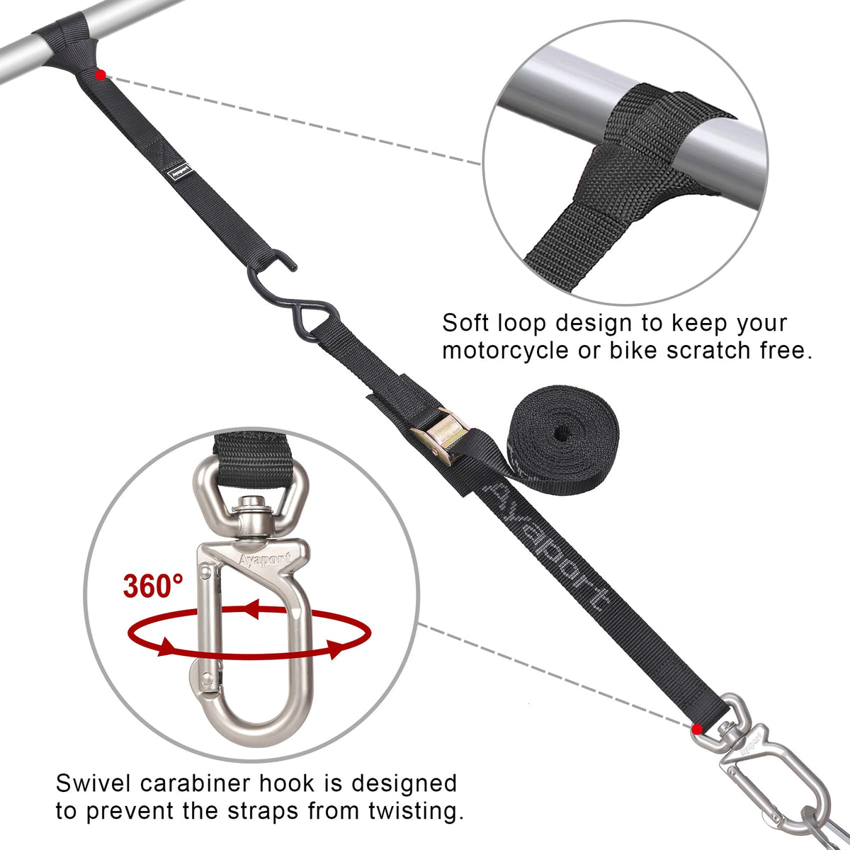HEAVY DUTY SWIVEL CARABINER HOOK. There is one swivel carabiner hook on one end of each motorcycle tie down strap. The swivel hook ensure you never gets tangles. The tie down straps with swivel hook also makes them easier to fit on trailer and the swivel always keeps the strap flat. Heavy duty tie down straps&buckle make sure our straps are sturdy, safe and easy to use | SIZE MEASUREMENT: 1 inch wide, 10 feet length; Load capacity: 1100lbs, Breaking strength: 2200lbs | MULTIPLE USES: Cam buckle tie down straps can be used to secure your motorcycle, dirtbike, truck, ATVs, motocross bikes and so on | EXTRA SOFT LOOP STRAPS: Our cam buckle tie down straps came with extra 4Pcs soft loop straps that keep your motorcycle or bike scratch free | PACKAGE INCLUDED: 4Pcs Cam buckle tie down straps with hook + Extra 4Pcs soft loop straps