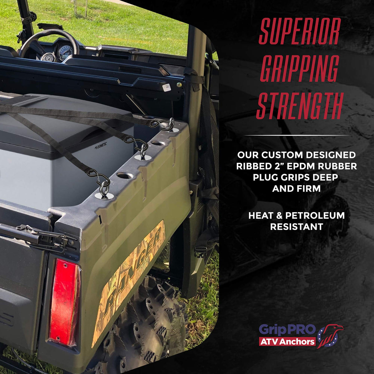 PLEASE NOTE: THESE DO NOT FIT RZR MODELS. NEW, IMPROVED DESIGN! Our Top-Selling, Top-Quality tie down anchors specially designed to fit Polaris have been redesigned for maximum gripping strength to securely attach your tie down straps, ropes or bungee cords. Our custom, ribbed expansion plug provides 3X the gripping strength of the competitions' plug! These are the best-selling tie down anchors for your Polaris Ranger or General on Amazon. And ? PROUDLY MADE IN THE USA ? We use a softer rubber compound that grips better so the anchor stays solid under harsh conditions. We also use a proprietary EPDM rubber plug designed to our specifications. Designed to fit the Lock & Ride holes, they fit tight and allow adding and moving tie down points as needed, on the trail or in the garage. No tools required - simply Twist, Lock and Go! FEATURES RIBBED EPDM rubber anchor expands evenly and holds much better than other anchors. MOUNTS quickly and easily on your Polaris Ranger or General with 1-7/16'' inch hole in the cargo rack or bed. HAUL all your hunting, fishing, recreational or work gear securely. MADE with American Made products, 316 Stainless Steel and Heavy Zinc plated hardware for the ultimate in corrosion resistance. LIFETIME WARRANTY against failure and Hand-assembled and Packaged in the USA! EACH set includes: Six (6): 5/16'' x 3 1/4'' Eye Bolt Fasteners made by GripPRO ATV Anchors. Please verify your ATV or UTV has a 1 7/16'' hole before placing order. See our other products for expansion anchors that fit other models with smaller holes. UPDATE: These anchors are currently ON SALE - put these in your cart and Order Today! ALSO AVAILABLE IN A 4-PACKhook loop eyelet tiedowns