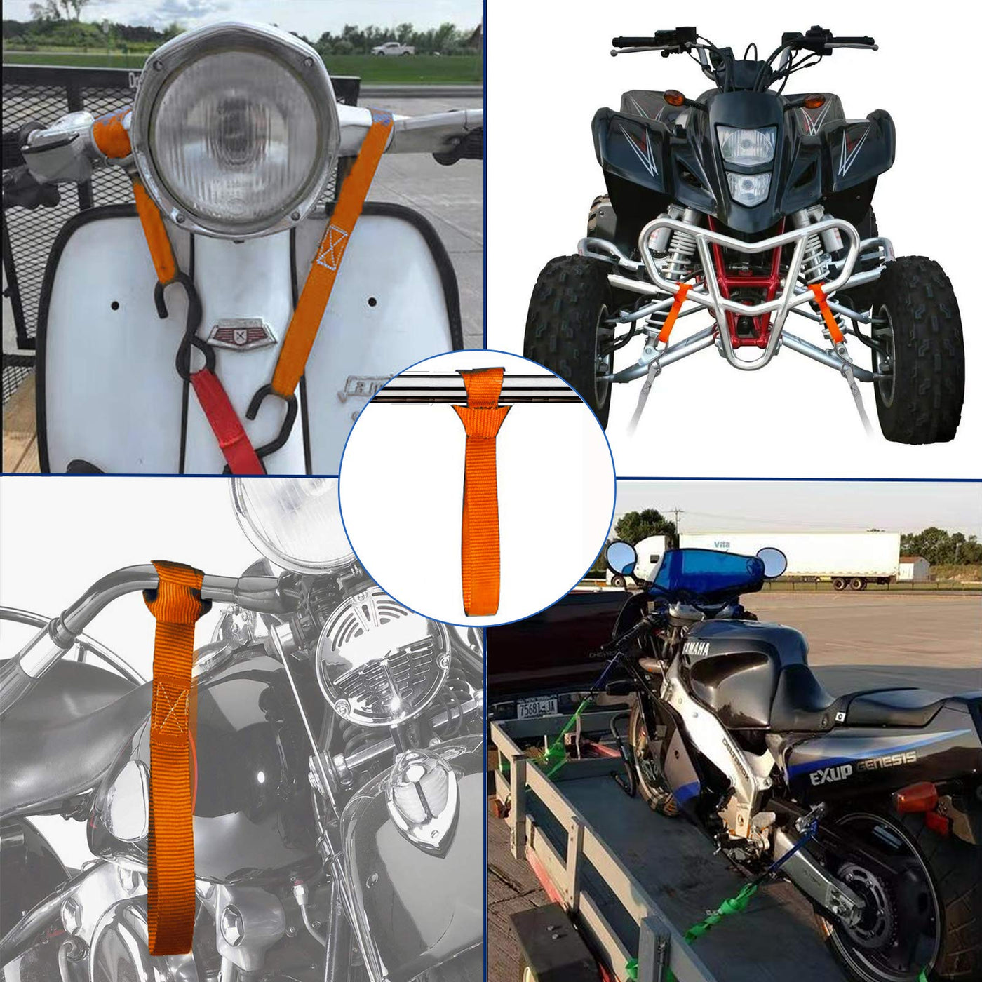 Q: What types of vehicles can I use these straps on?A: You can use these straps on motorcycles, scooters, dirt bikes, wheelchairs, and other similar vehicles.