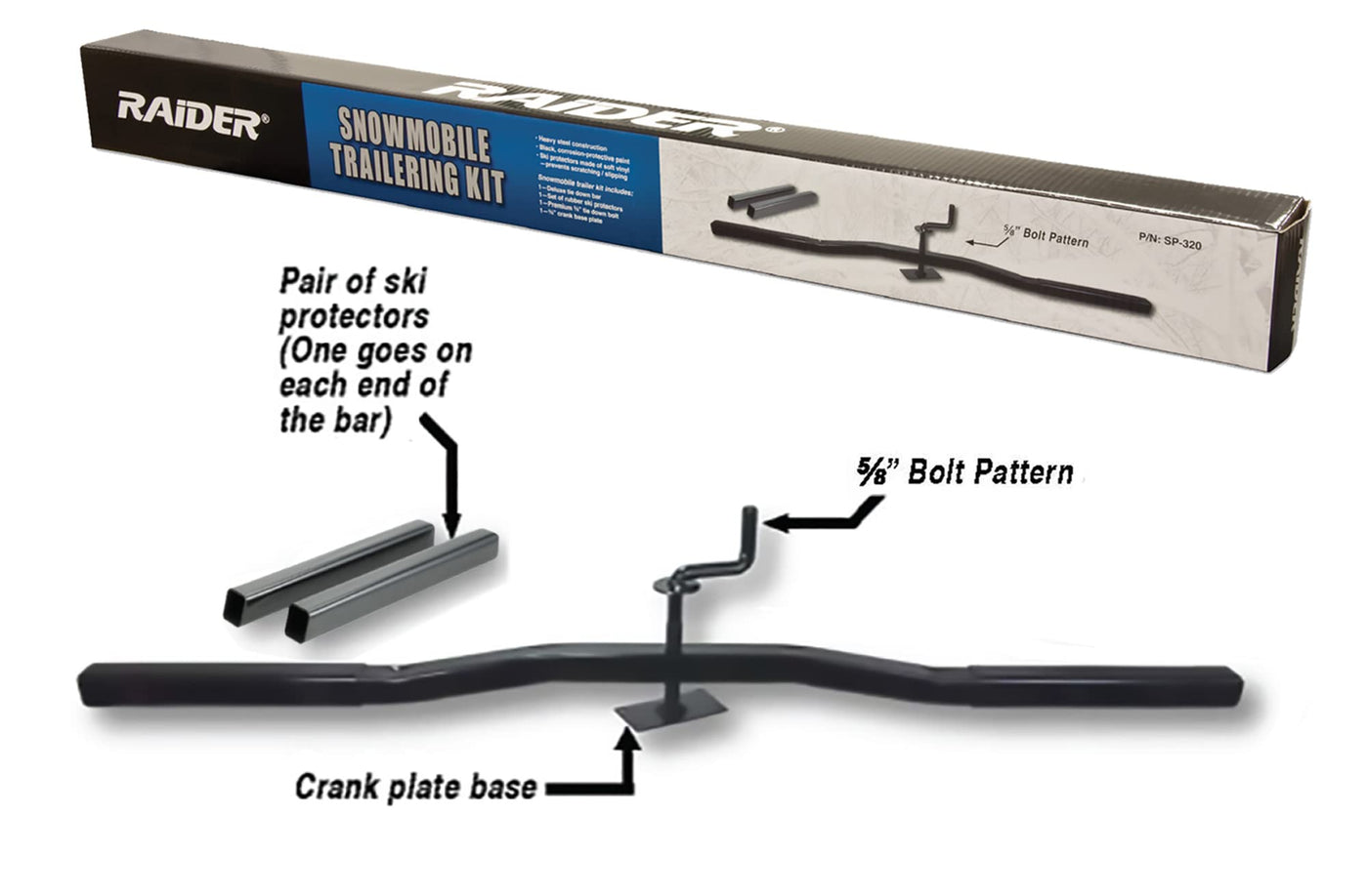 The Raider SP-320 5/8 Tie Down Kit keeps your snowmobile in one place on the trailer. The tie down bar, bolt, and crank plate are constructed of heavy duty steel for lasting durability. The included ski protectors are made of soft vinyl and fit on the trailer tie down bar to protect your snowmobile skis from slipping, paint chipping, and rusting. This kit includes everything you need to keep your snowmobile in place while traveling.