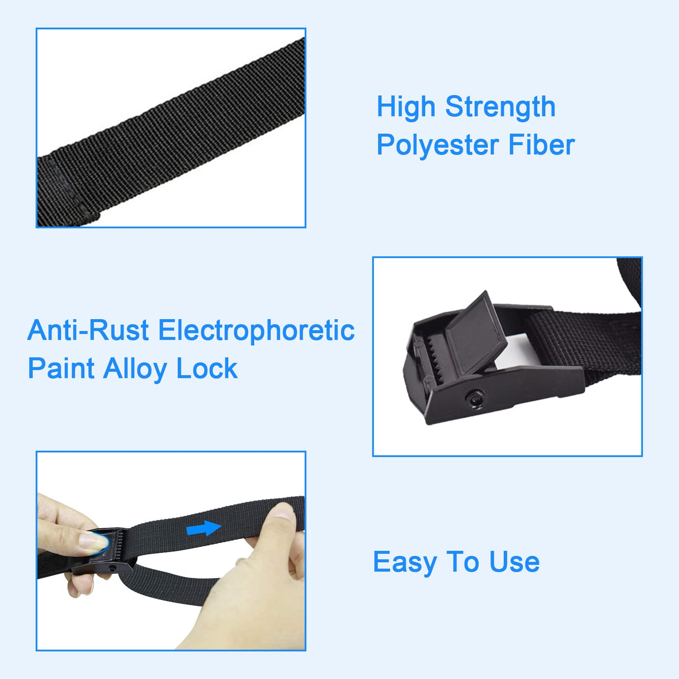 - Q: What makes these tie down straps heavy-duty? A: The heavy-duty designation comes from their durable nylon material and robust cam buckle mechanism, which provides enhanced strength and reliability.