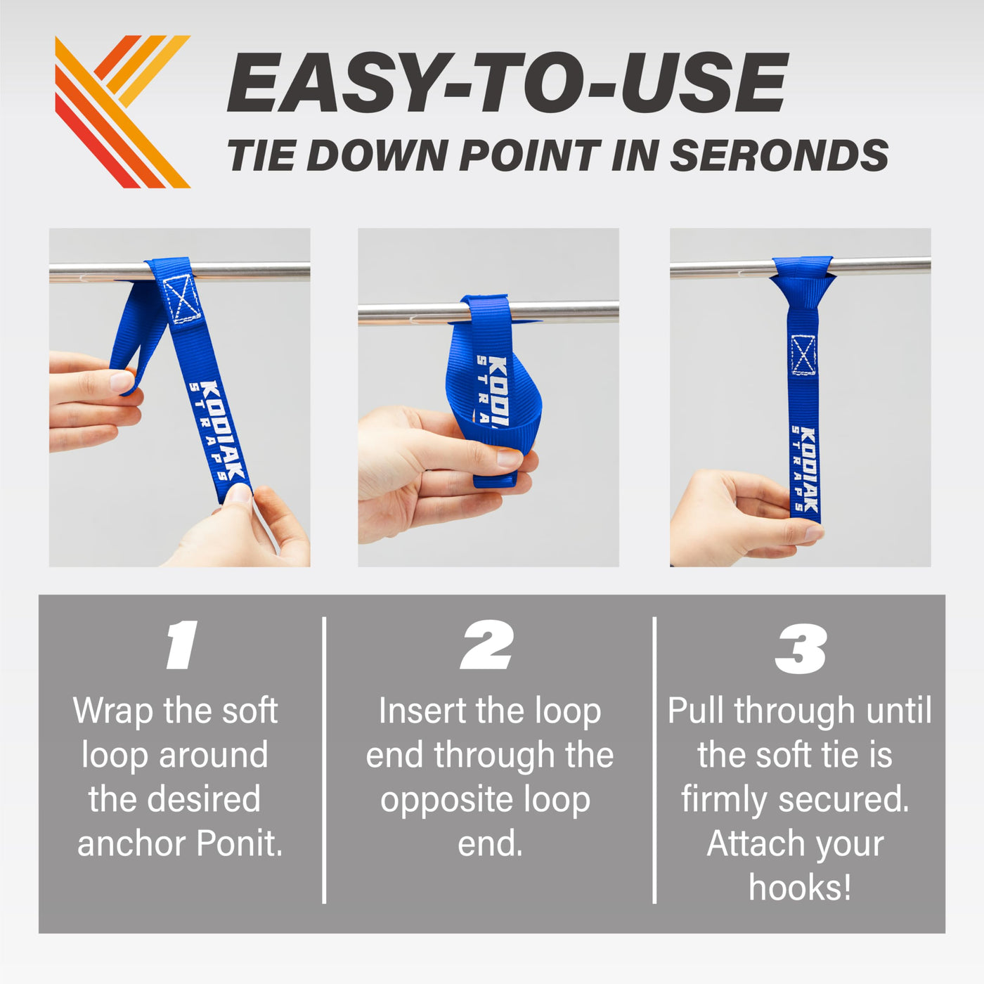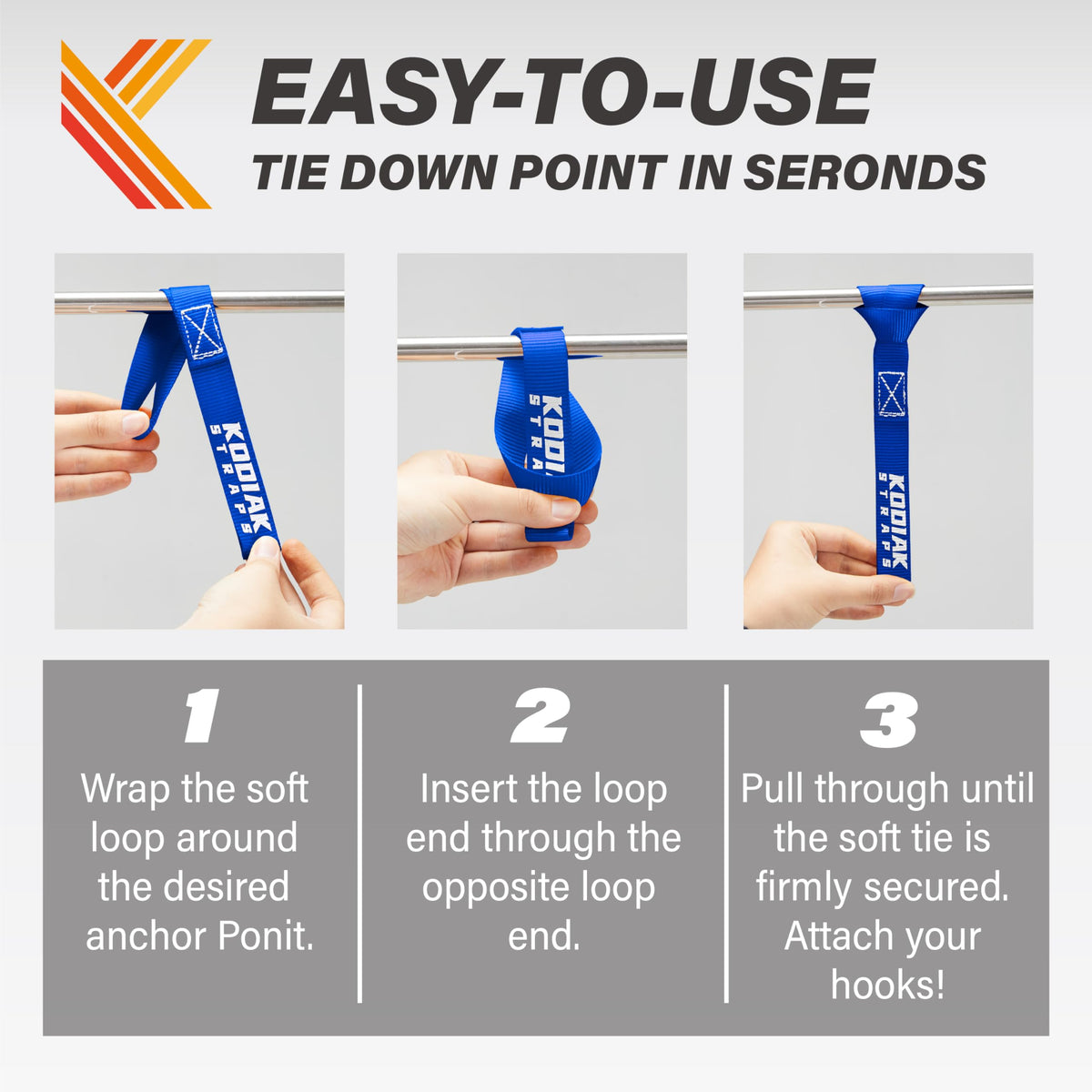 Q: How do I use the Soft Loop Tie Down Straps?A: To use the Soft Loop Tie Down Straps, simply cinch the loop around the frame of your equipment and attach the tie-down hook to the soft loop, providing a secure hold without scratching.