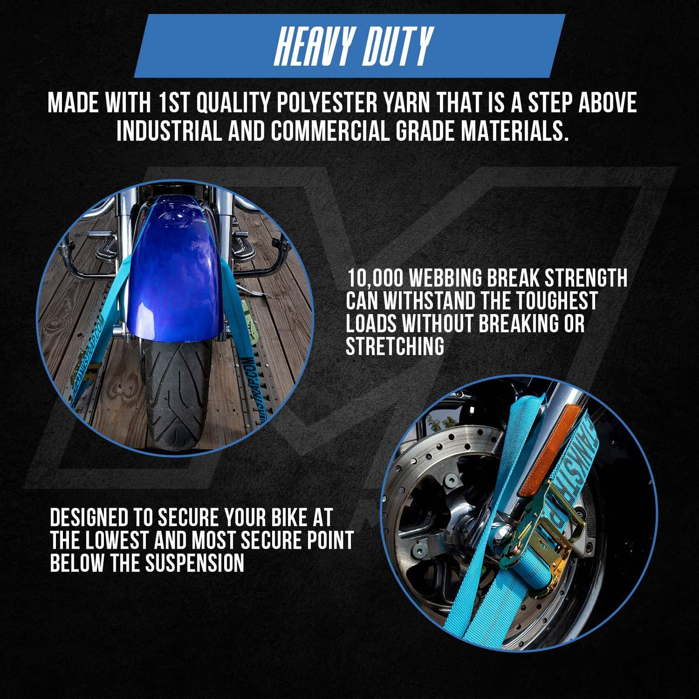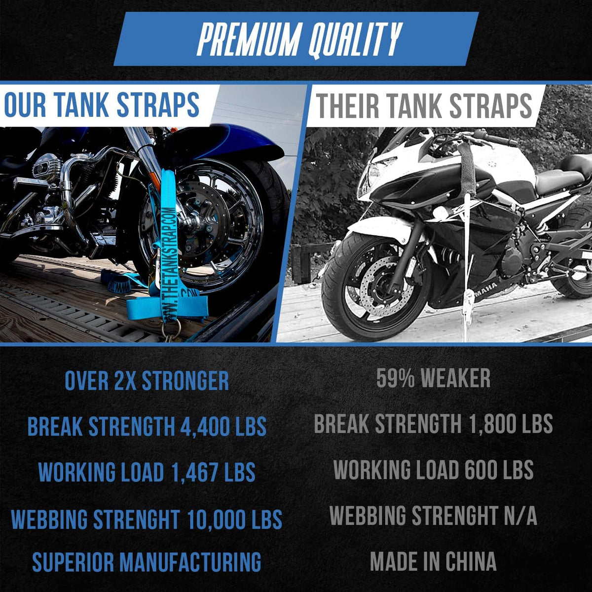 NEVER WORRY ABOUT TRANSPORTING YOUR BIKE AGAIN: The peace of mind that you get when using The tested and proven Tank Moto TANK STRAPS!MY MOTORCYCLE DEALERSHIP USES TANK STRAPS EVERYDAY: I own a motorcycle Dealership called SRK Cycles and we needed to find a good strong tie strap strap to use when transporting our motorcycles which we do daily. We needed something STRONG, RELIABLE, and LONG LASTING. That could transport all makes and models including Harley Davidson, BMW, Suzuki, Kawasaki, Honda, Yamaha, Vespa, Moto Guzzi, Triumph, Victory, Indian Motorcycles, Ducati, Aprilia.3 YEARS AND THOUSANDS OF MILES: We had our first set of Tank Straps made for us 3 years ago and have used them to transport hundreds of motorcycles thousands of miles and still use them today.THIS IS THE SAFEST WAY TO TRANSPORT YOUR MOTORCYCLE: because it puts no stress on the suspension and because of the endless loop design the motorcycle will never come unhooked.NO SOFT TIES NEEDED: most motorcycle ratchet straps require you to also buy soft ties or soft loops so that you can get the strap around the bike, with Tank Straps you wont need soft loops.These Straps Dont Stretch.10,000lb Webbing Max Break Strength4,400lb Total Strap/buckle Break StrengthNo hooks to come undone.Endless loop for safety.No pop when you release.Absolute overkill for piece of mind trailering.