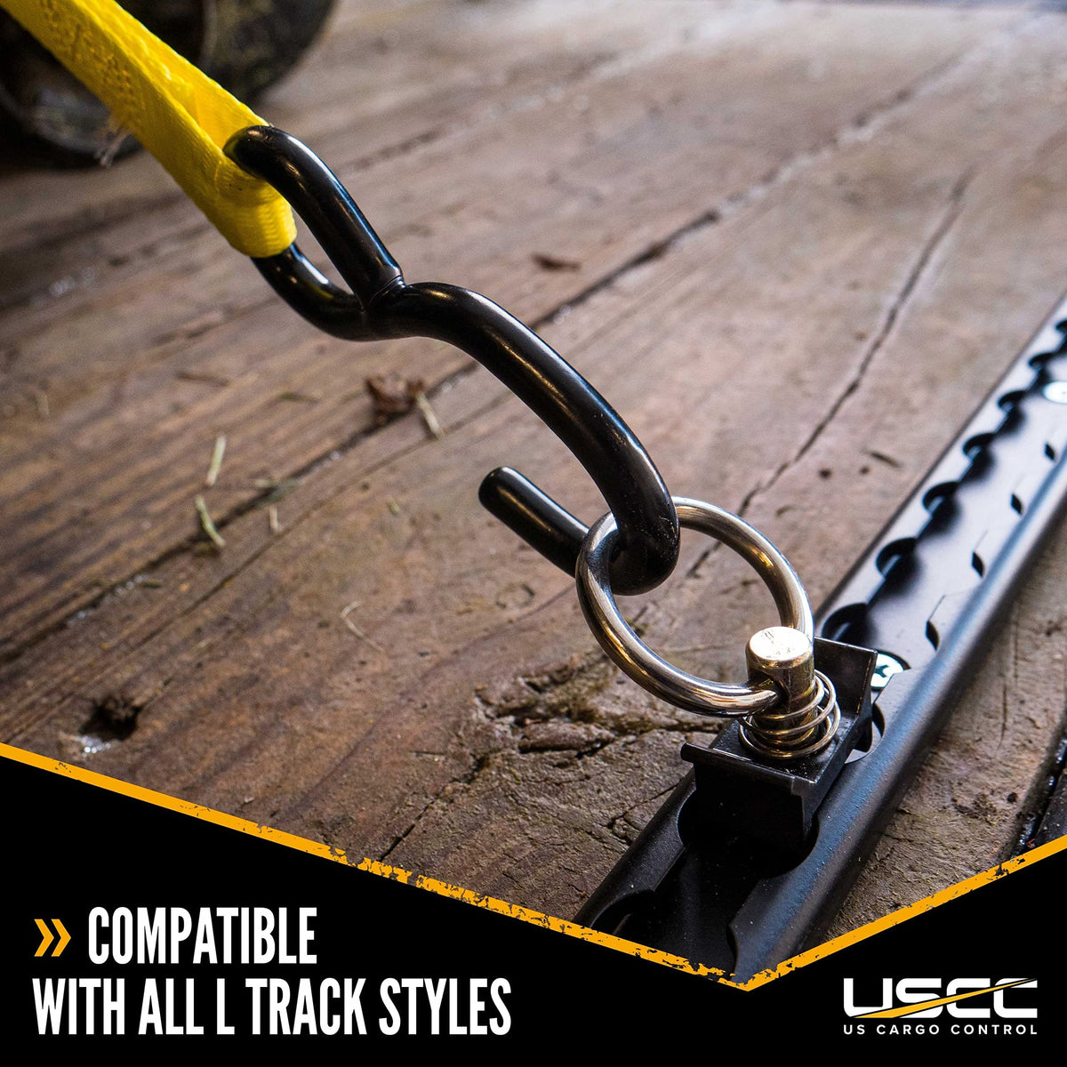 L Track Fittings are designed to create secure tie-down points on L-Track rails. L Track, also known as Logistic Track or Airline Track is a versatile tie-down system used to secure a range of cargo. It is commonly installed in pickup truck beds, vans, and utility trailers, to transport cargo such as motorcycles, ATVs, utility tractors, and much more. This L Track stud fitting features a large O-Ring which accepts a wide variety of hooks, snaps, and straps. Once installed, has a working load limit of 1,333 lbs in a straight line pull, 1,000 lbs in a 45 degree pull and 666 lbs in a 90 degree pull. It's manufactured with a stainless steel ring and black powder coat finish to resist rust and corrosion. The black finish also allows you to coordinate with other black painted L Track system components for a sleek, and finished look. The spring-loaded plunger-style mechanism is easy to use: place thumb inside the ring and push down on the stud while lifting the clip with your index and middle fingers. Insert the bottom disc into the desired round opening on the track. Slide the airline track fittings in either direction so it's halfway between two of the tracks openings and let the clip fall on both sides of the fitting in the round slots on either side of the stud. To remove, simply lift the clip, slide to an opening and remove from the track. So, before you secure your cargo for transit, tie-down with confidence using high-quality and reliable L Track Accessories like this Black L Track Single Stud Fitting with Round Ring from US Cargo Control! Sold as a 4-pack.