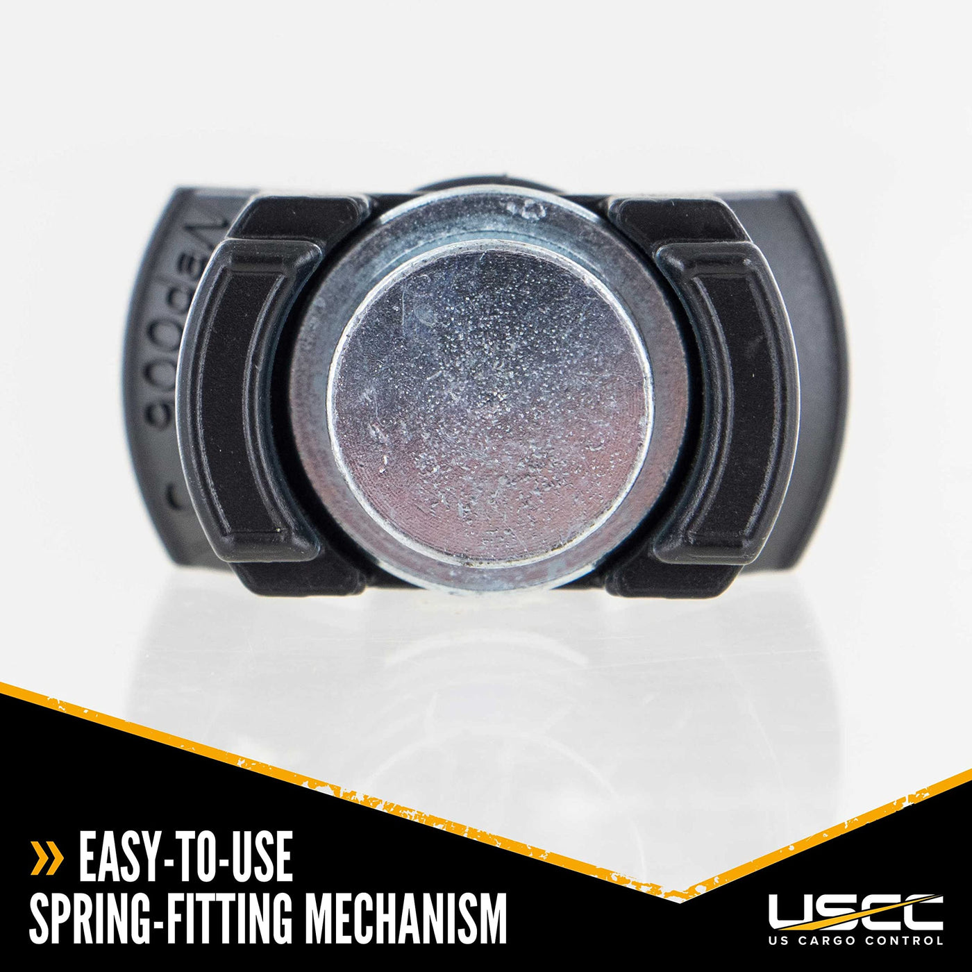 Single Stud L Track Fittings are designed to create secure tie-down points on L Track rails. L Track, also known as Logistic Track or Airline Track is a versatile tie-down system used to secure a range of cargo. It is commonly installed in pickup truck beds, vans, and utility trailers to transport cargo such as motorcycles, ATVs, utility tractors, and much more. This L Track stud fitting features a D-Ring which is large enough to accommodate a variety of hooks, straps, and other connectors. A pliable black rubber covers the spring to protect it from rust and corrosion. The heavy-duty plastic base keeps the fitting lightweight and easy to handle, while the flanged edges make it comfortable to grip and push into place. This airline track fittings manufactured with a stainless steel ring and aluminum stud for excellent resistance to corrosion and rust. Once installed, it has a working load limit of 1,333 pounds, so you can tie-down with confidence knowing your cargo is safe and secure. The spring-loaded plunger-style mechanism is easy to use: place thumb inside the ring and push down on the stud while lifting the clip with your index and middle fingers. Insert the bottom disc into the desired round opening on the track. Slide the fitting in either direction so it's halfway between two of the tracks openings and let the clip fall on both sides of the fitting in the round slots on either side of the stud. To remove, simply lift the clip, slide to an opening and remove from the track. So, before you secure your cargo for transit, make sure you're using high-quality and reliable L Track Accessories like this L Track Single Stud Fitting with D-Ring from US Cargo Control! Sold as a 10-pack.