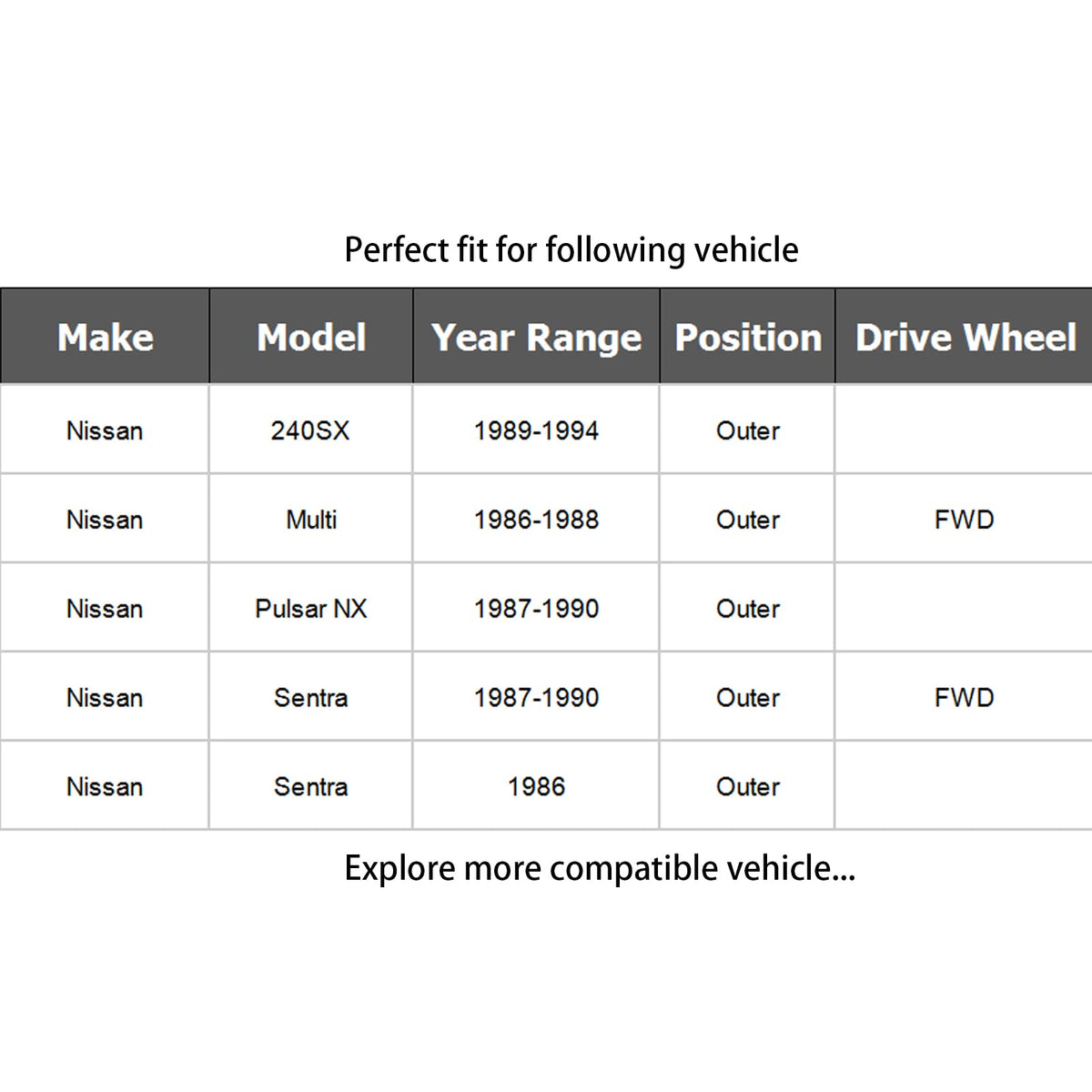 Package Includes: 2x Front Outer Tie Rod End- ES2814RL 2x Front Inner Tie Rod End - EV169 Fitment: Compatible with 1989-1994 Nissan 240SX Compatible with 1986-1988 Nissan Multi (FWD Models) Compatible with 1987-1990 Nissan Pulsar NX Compatible with 1987-1990 Nissan Sentra (FWD Models, with 16mm Threads on Rack) Compatible with 1986 Nissan Sentra (with 16mm Threads on Rack)