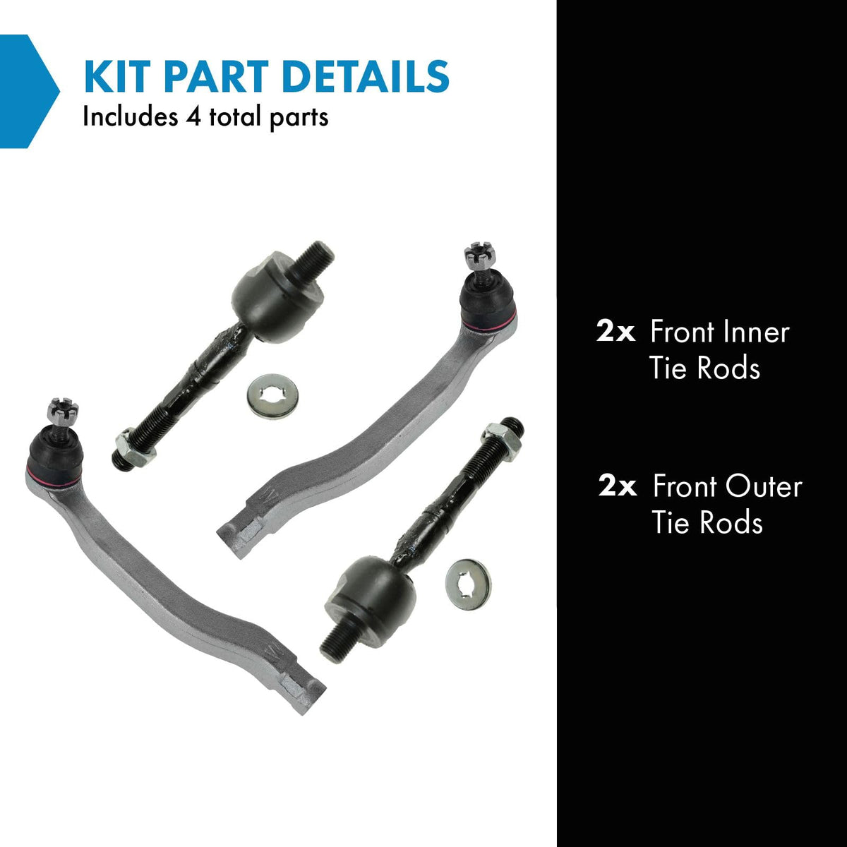 4 Piece Tie Rod SetKit Includes(2) Front Inner Tie Rods(2) Front Outer Tie RodsFitmentCompatible with: 1998-02 Honda Accord Sedan V6 3.0L Front Driver & Passenger Side Inner & OuterCompatible with: 1998-00 Honda Accord Coupe Front Driver & Passenger Side Inner & OuterProduct AttributesQuantity: 4 PieceReference NumbersDIY Solutions: SUS03075, SUS07431, SUS07432, SUS07611Honda: 53010S87A01Mevotech: MES3490, MES3491, MEV423MOOG Chassis Products: ES3490, ES3491, EV423