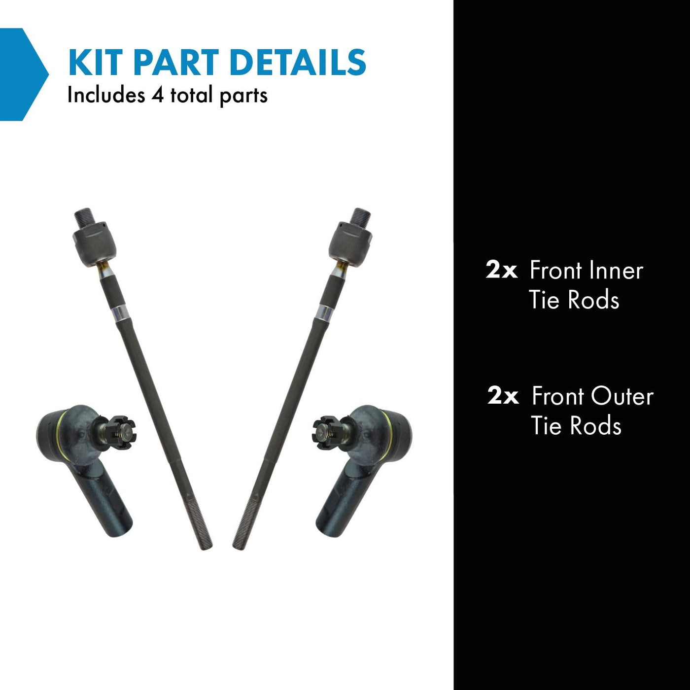 4 Piece Tie Rod SetKit Includes(2) Front Inner Tie Rods(2) Front Outer Tie RodsFitmentCompatible with: 2006-13 Suzuki Grand Vitara Front Driver & Passenger Side Inner & OuterProduct AttributesQuantity: 4 PieceReference NumbersBeck/Arnley: 101-5191, 101-5329DIY Solutions: SUS03289, SUS08001, SUS08002Mevotech: MS80600MOOG Chassis Products: ES800363, EV800362