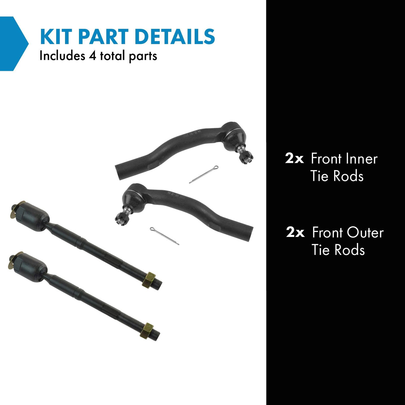 4 Piece Tie Rod SetKit Includes(2) Front Inner Tie Rods(2) Front Outer Tie RodsFitmentCompatible with: 2007-11 Toyota Camry LE Front Driver & Passenger Side Inner & OuterCompatible with: 2007-11 Toyota Camry SE Front Driver & Passenger Side Inner & OuterCompatible with: 2007-11 Toyota Camry XLE Front Driver & Passenger Side Inner & OuterCompatible with: 2007-11 Toyota Camry Base Model Front Driver & Passenger Side Inner & OuterCompatible with: 2007-08 Toyota Camry CE Front Driver & Passenger Side Inner & OuterCompatible with: 2005-12 Toyota Avalon Front Driver & Passenger Side Inner & OuterCompatible with: 2007-12 Lexus ES350 Front Driver & Passenger Side Inner & OuterProduct AttributesQuantity: 4 PieceReference NumbersDIY Solutions: SUS02362, SUS07837, SUS07838, SUS07842Mevotech: MES80602, MES80603, MS86716MOOG Chassis Products: ES80602, ES80603, EV800085Toyota: 4546009050, 4546009110, 4546039635, 4547009040, 4547009080, 4547039225, 45470A9030, 4550309420, 4550339275