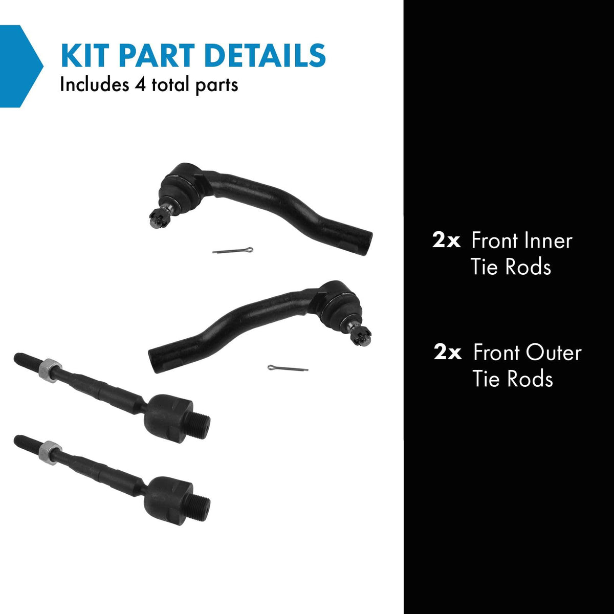 4 Piece Tie Rod SetKit Includes(2) Front Inner Tie Rods(2) Front Outer Tie RodsFitmentCompatible with: 2007-14 Ford Edge Front Driver & Passenger Side Inner & OuterCompatible with: 2007-15 Lincoln MKX Front Driver & Passenger Side Inner & OuterProduct AttributesQuantity: 4 PieceReference NumbersDIY Solutions: SUS02328, SUS07832, SUS07833, SUS07834Ford: 7T4Z3280A, 7T4Z3A130A, 7T4Z3A130BMevotech: MS40609, MS40610, MS40704MOOG Chassis Products: ES800473, ES800474, EV800576