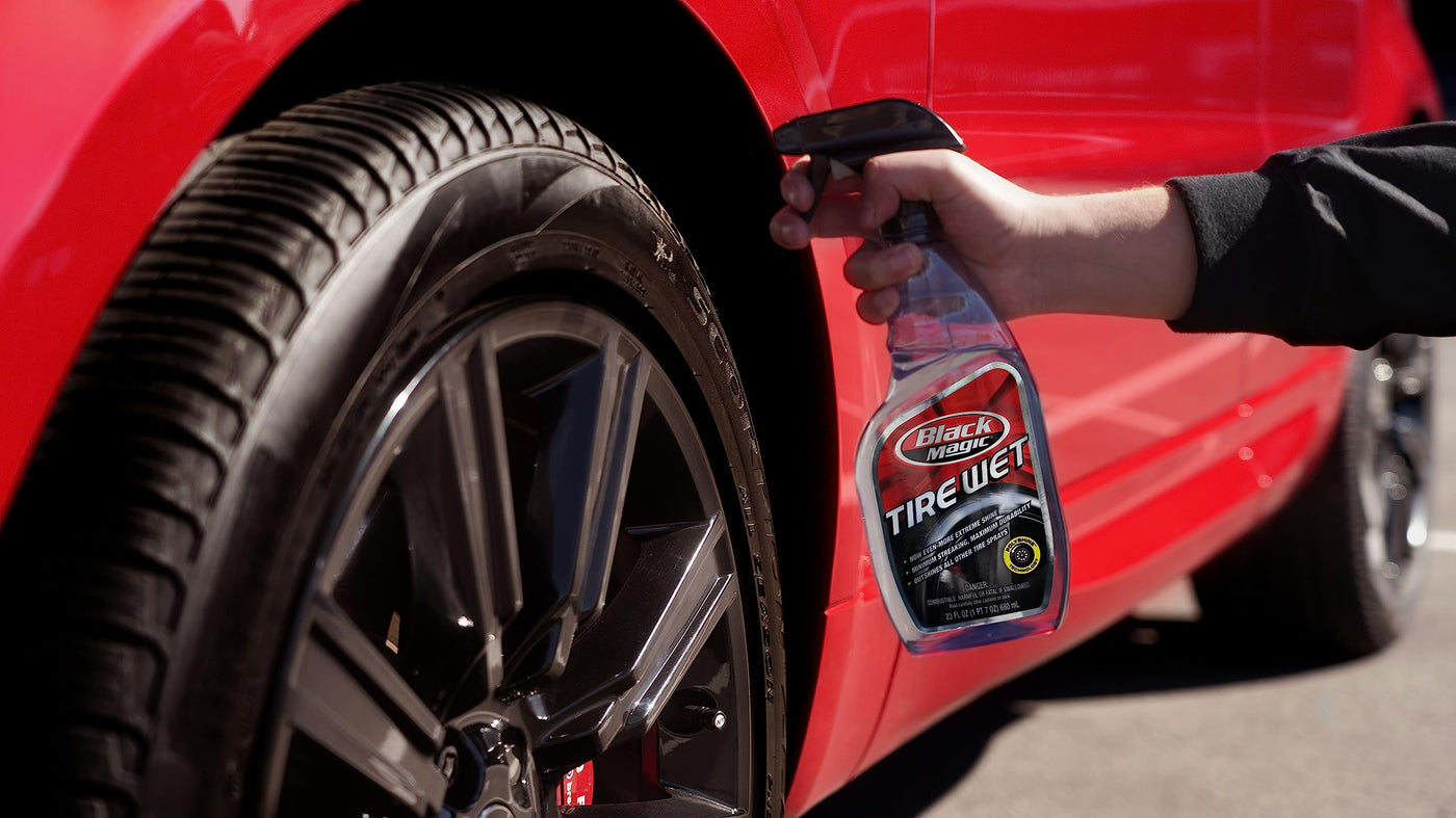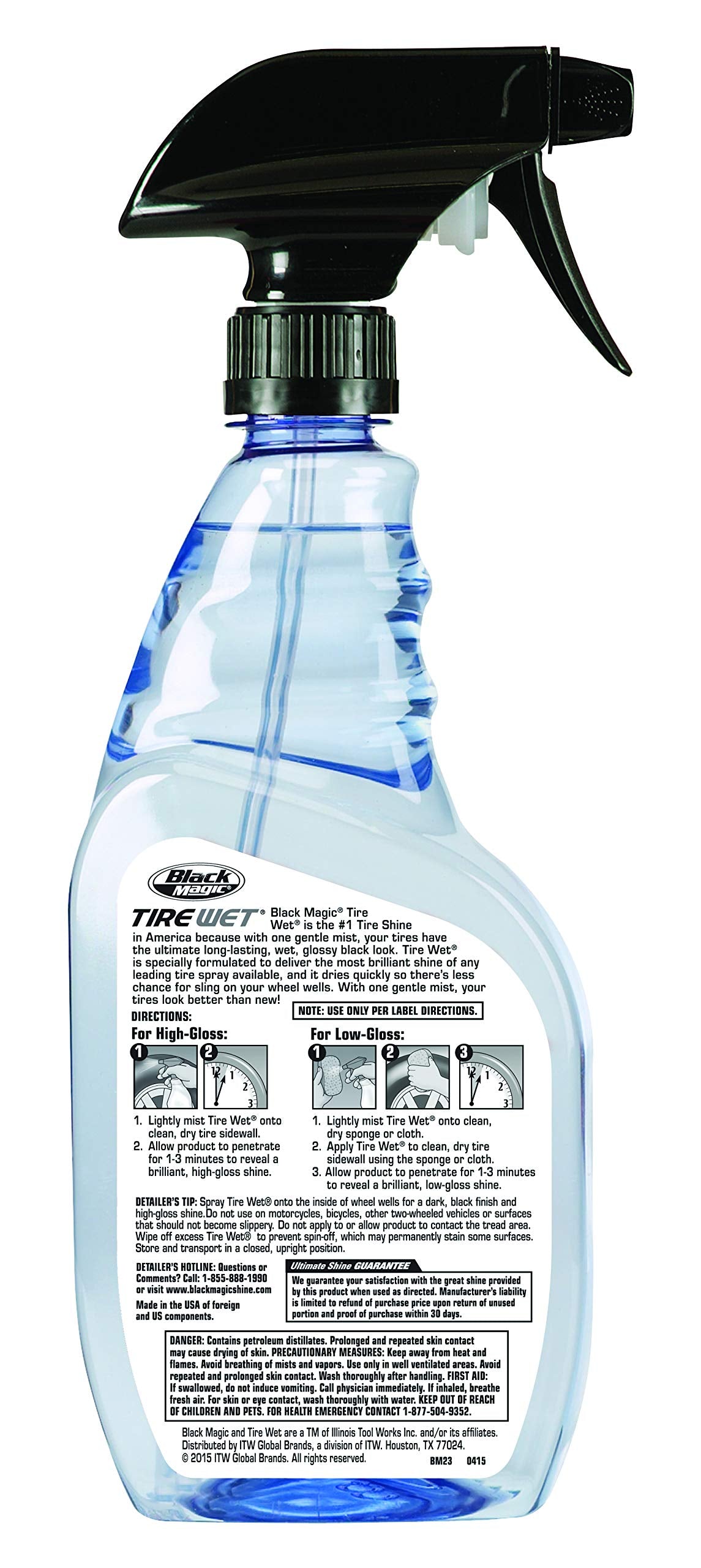 Q: How do I apply Black Magic Tire Wet for the best results?A: To apply Black Magic Tire Wet, simply spray it onto the tire surface and allow it to dry. For optimal results, ensure tires are clean before application and avoid overspray on the vehicle's body.