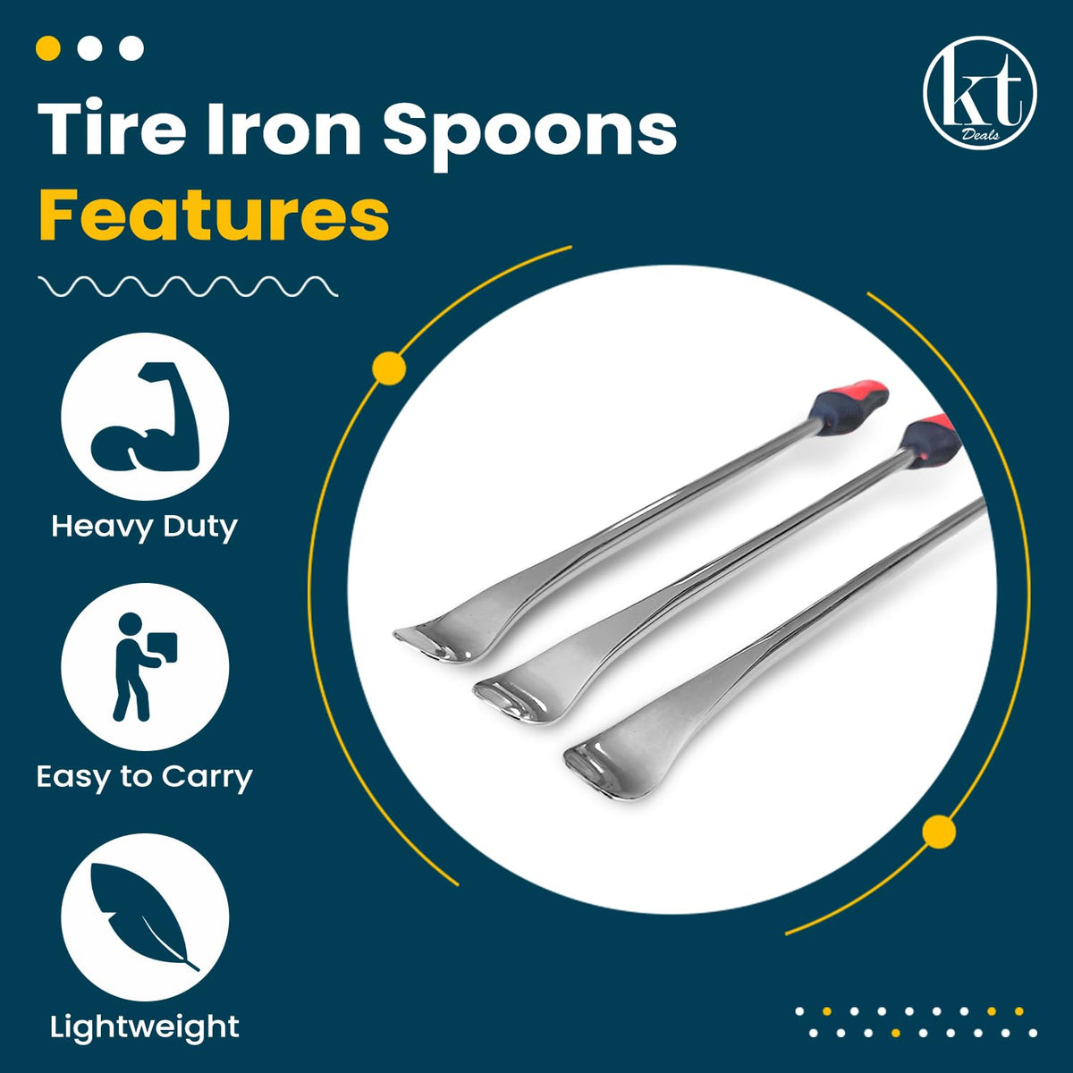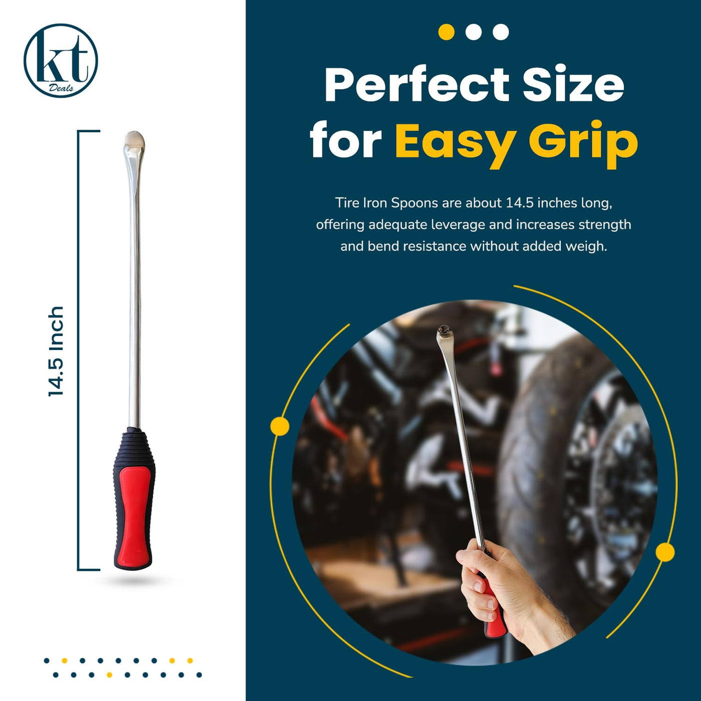 Q: What is the length and size of the tire iron spoons?A: Each tire iron spoon in the set measures 14.5 inches in length, which is ideal for providing sufficient leverage for efficient tire changes across various vehicles.