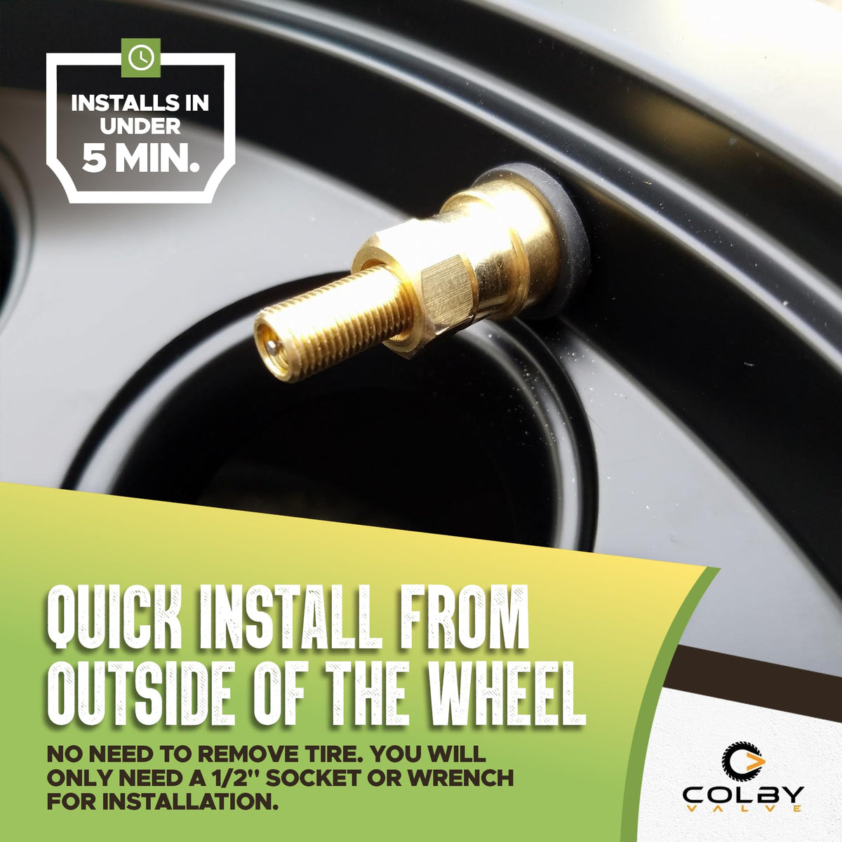 Colby Valves are the first tire valves made to install from the outside of the wheel, without any tire removal. Our Permanent Valves can be installed at home, from the outside of the wheel, without tire removal, in about 1 minute. You will need to tighten them down firmly but not excessively with a 1/2 socket or wrench. They are 20X stronger than normal valves and will help you avoid many common valve issues up-front. They aren't indestructible, but they will take one heck of a beating. Consider them an amazing rigid valve that can be installed without breaking the bead.