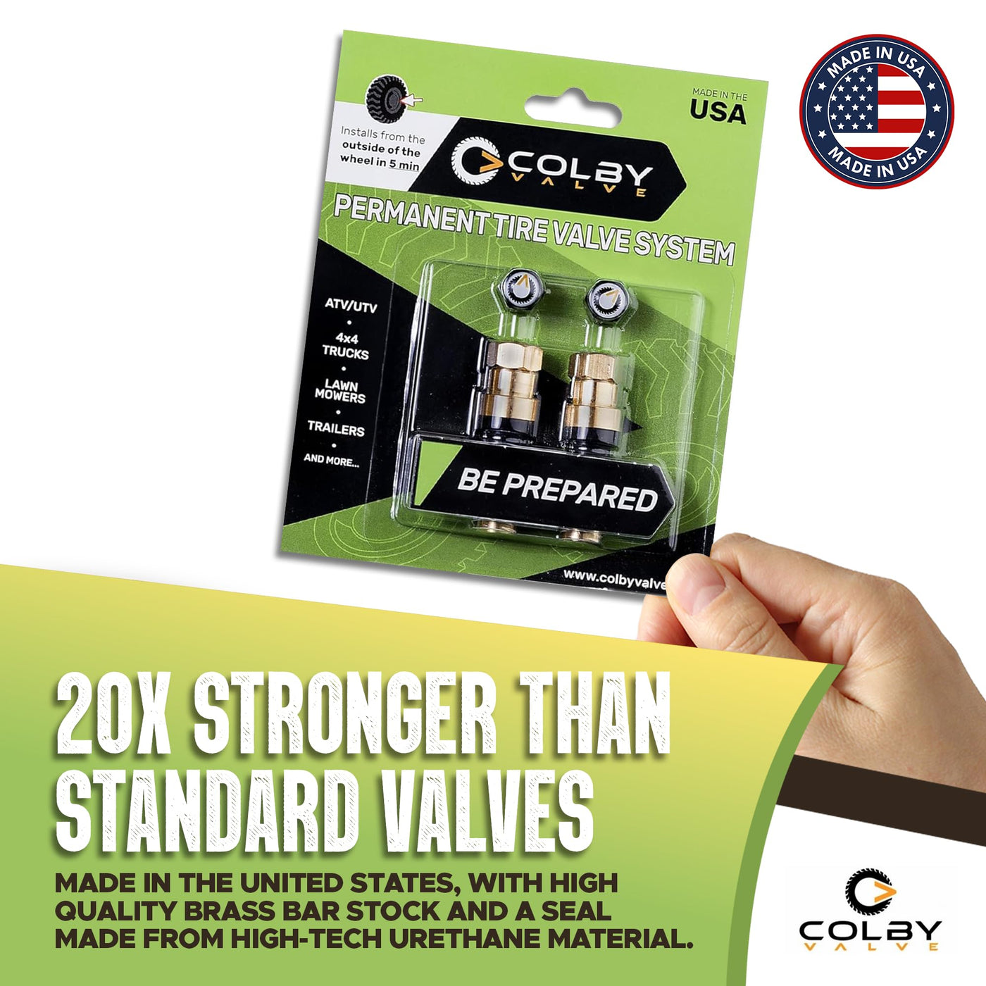 Q: How much stronger are Colby Valves compared to standard valve stems?A: Colby Valves are 20 times stronger than normal valve stems, which helps prevent common valve issues and ensures durability and reliability in various conditions.