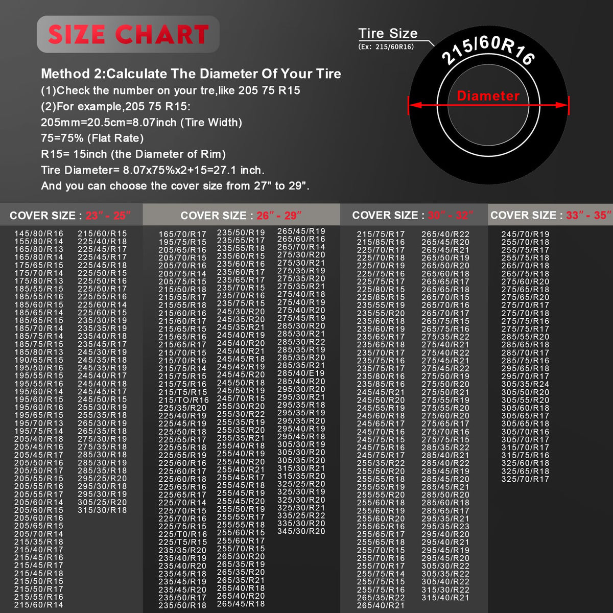 Features of 2 Packs RV Wheel Tire Covers: ?Heavy-Duty Material RV Tire Cover?Made of 600D PU Oxford, Comnova waterproof tire covers have better flexibility and tensile strength than Vinyl, Non-woven fabric, 600D Oxford. PU coating material will be more breathable and better to prevent rust. ?2 Packs 30''-32'' Tire Cover?Fits 30 - 32 tire diameters. Universal used on RV, 5th wheel, travel trailer, class a, class c, jeep, camping, truck. **Note: if your tire diameter is just 32, it would be better to choose larger size (30''-32''). ?Tire Cover with Hook Design? Elasticized back hem and hook for you to keeps the tire protectors stay on the RV wheel securely even on windy days, it is easy to put on or remove. ?Functional RV Tire Covers?This RV tire covers can help prevent premature cracking of sidewalls that can lead to on-road blowouts, prolonging the lifespan of your tires, as well as protect the wheel and tire from dust, corrosion, dry rot, snow, ultraviolet and high temperature. ?Wind Resistant Tire Cover?Elasticized back hem and hook design for a secure fit. The cord keeps the tire cover stay on the wheel even on windy days. Easy to install and remove. Warm Prompt: 1.Please measure the distance across the center of the front of the tire from edge to edge. And then measure the depth of the tire itself. 2.Don't need to choose the bigger one, as the elasticized back hem & hook would provide you a custom fit and easy installation. covers tire wheel rv cover for trailer inch set of trailers camper travel tires syeral pack dual up trucks truck shade rvtire rvs rav pop marine magne large hub heavy eluto duty corp camping campers bus boat