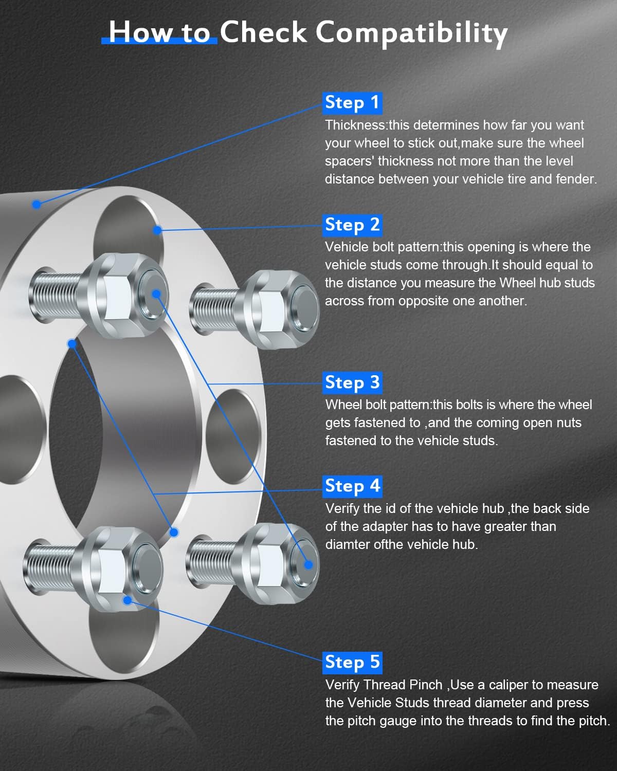 Q: How do I install the ECCPP Wheel Spacers?A: To install the ECCPP Wheel Spacers, ensure your vehicle's hub bolt size matches the spacers' thread pitch of 1/2 inch. Use standard tire repair tools, a torque wrench, and a lug socket. After installation, check and re-torque all hardware after 50-100 miles of driving.