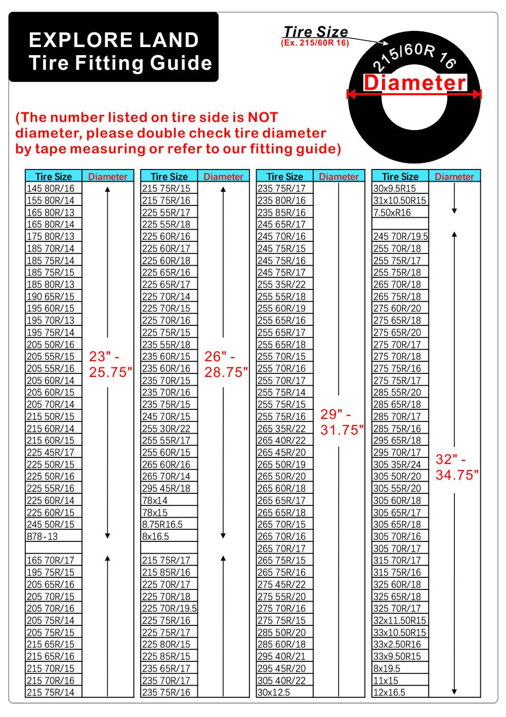 Q: What tire sizes does the Explore Land Tire Cover fit?A: The Explore Land Tire Cover is designed to fit tire diameters from 26 inches to 28.75 inches. It is available in multiple sizes including S, M, L, XL, 2XL, and 3XL, accommodating a wide range of tire dimensions.