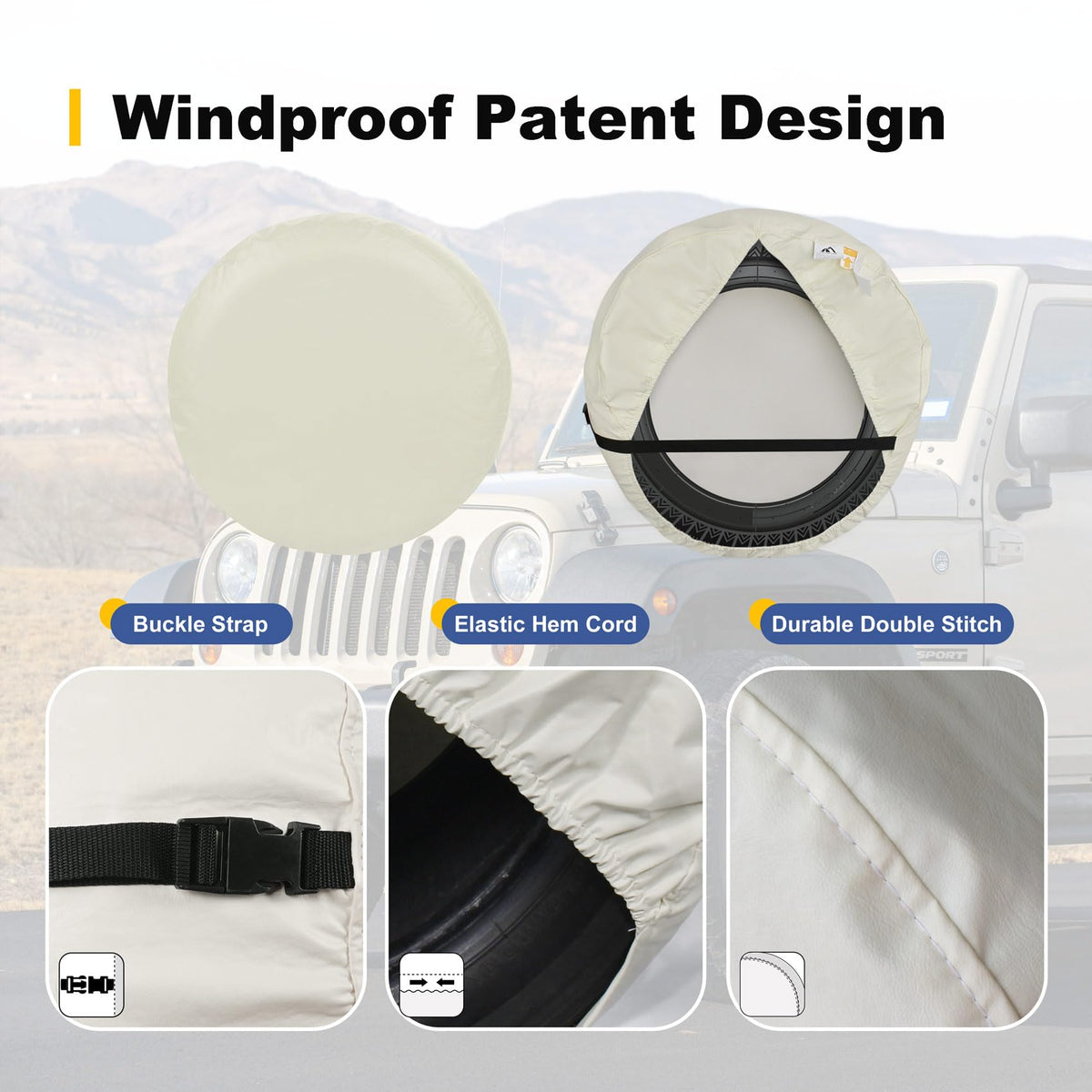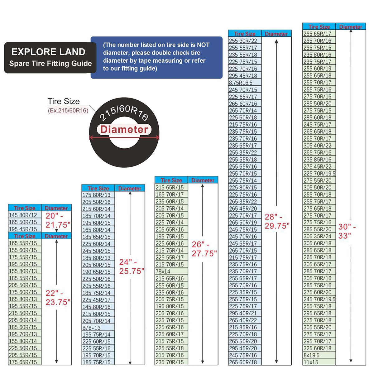 About Spare Tire Cover 1.Material: Vinyl 2.Color : Off White 3.Dimension: XXS: 20in- 21.75in Fits tire diameters XS:20in to 21.75in S: 22in- 23.75in Fits tire diameters S:22in to 23.75in M: 24in- 25.75in Fits tire diameters M:24in to 25.75in L: 26in- 27.75in Fits tire diameters L:26in to 27.75in XL:28in- 29.75in Fits tire diameters XL:28in to 29.75in XXL:33in- 33in Fits tire diameters XXL:30in to 33in 4.The spare tire cover made of vinyl material is waterproof,dust-proof and protect against the sun's harmful UV rays. 5.Great to your tire and wheels prevent from sun damage, rust and dirt. 6.Measure the diameter and width of tire before your purchasing, you can also refer to our fitting guide, for any question please contact us for one-on-one service. 7.Universal fits for Jeep, Trailer, RV, SUV, Truck, or anything with the correct tire size. 8.3 YEAR WARRANTY. We are totally obsessive about quality and customer service, if you have any questions please get in touch and we will do everything we can to solve them. For more high quality items, please visit Explore Land Amazon Store.