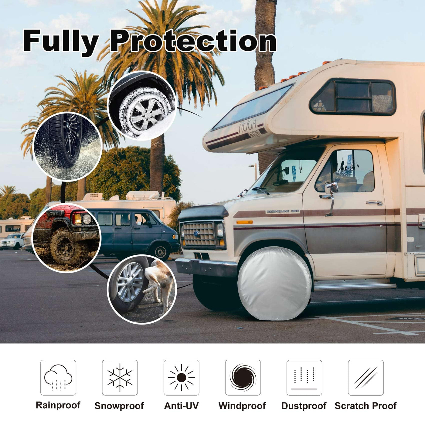 4 pack of tire cover is made from tough alumium universal fits for trunk, car, truck, SUV, trailer, camper, motorhome and RV. Color: Silver Dimensions: S: 26 ' 'x25.5 ' 'x8 ' ', Fits Tire Diameters up to S: 23 ' '-25.75 ' ' M: 30 ' 'x29 ' 'x8.5 ' '. Fits Tire Diameters up to M: 26 ' '-28.75 ' ' L: 33 ' 'x32 ' 'x9 ' ', Fits Tire Diameters up to L: 29 ' '-31.75 ' ' XL: 36 ' 'x35 ' 'x9 ' ', Fits Tire Diameters up to XL: 32 ' '-34.75 ' ' Note: Its NOT the rim size. How to choose the correct size? * Refer to our Tire Fitting Guide There are significant marked on the back edge of the tire. You can easily determine the size and then refer to our fitting guide picture for size selection. If you are still not sure how to choose the correct size, please email us to solve.-- Best Choice * Measure After check in the tire diameter by tape measuring, select against tire diameter data. About Tire cover 1. RV tire covers are made of high reflective aluminum better UV resistance than vinyl and polyester, double stitched prevent cracking and tearing for enhanced durability. 2. Protects tires and wheels from sun, rain, snow, dust, scratch, rust, corrosion and all types of weather damage when your vehicle is parked. Easy to clean by gently wipe with a soft brush, plus little soap 3. 4 pieces in 1 set. Tire protector is tough and folds up compact for easy storage and fit the Car, Pick-up, Truck, SUV, Trailer, Motorhome. 4. Elastic cord with auto-lock design has remarkably raised the wind resistance capacity and we don 't need ties, hook or holes anymore to stay in high wind. 5. Protects tires from scratching, cracking, corrosion in outdoor weather conditions to extend tires live. For more high-quality items, please visit Explore Land Amazon Store.