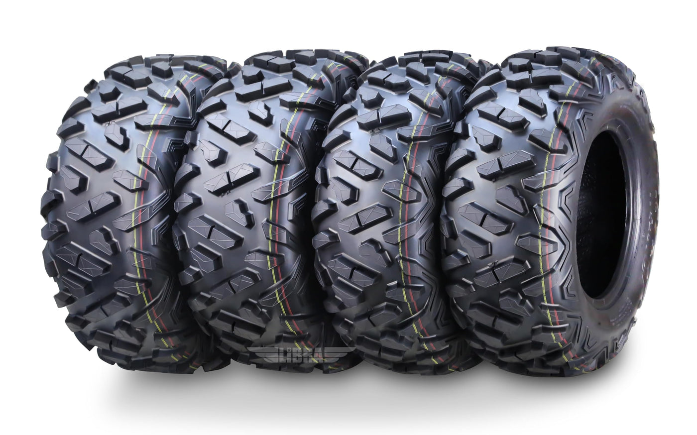 Complete set (2 front + 2 rear) tires for replacement of variety of ATV UTV applications. Top notch handling & superior traction offer a significantly smoother ride in dirt, mud or rock, woods and desert. Additional large shoulder lugs protect rim and sidewall,added traction and improved appearance. Non-directional tread pattern, Riding cleat for smoother trail riding. Heavy 4/6 ply rated nylon construction resists punctures and abrasions. Tires only, wheels not included