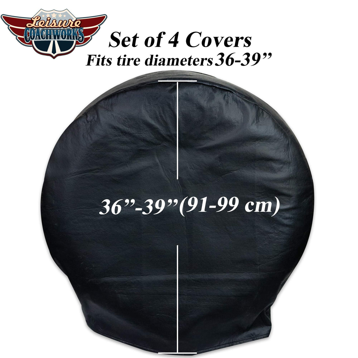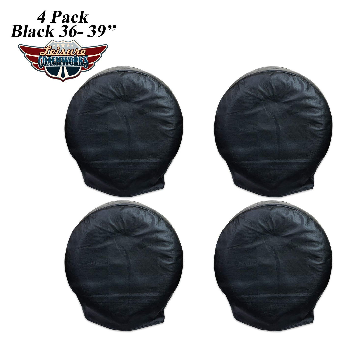 4 Pack Leisure Coachworks Black Heavy Duty Vinyl Tire Covers 36-39'' Tire Diameter Product description: Fits 36'' to 39'' diameter tires for RV,Trailer, Caravan, Camper,large lawn tractor tires, cars, trucks etc Wheel /tire covers are made of durable,soft vinyl with cotton backing, waterproof, resistant, protect the tires/wheels from sun, dirt, corrosion and all types of weather. With non-scratch soft backing, black color,fast and easy slip-on design Eyelet with cord ensures more secure fit Package includes: 4 RV wheel Covers