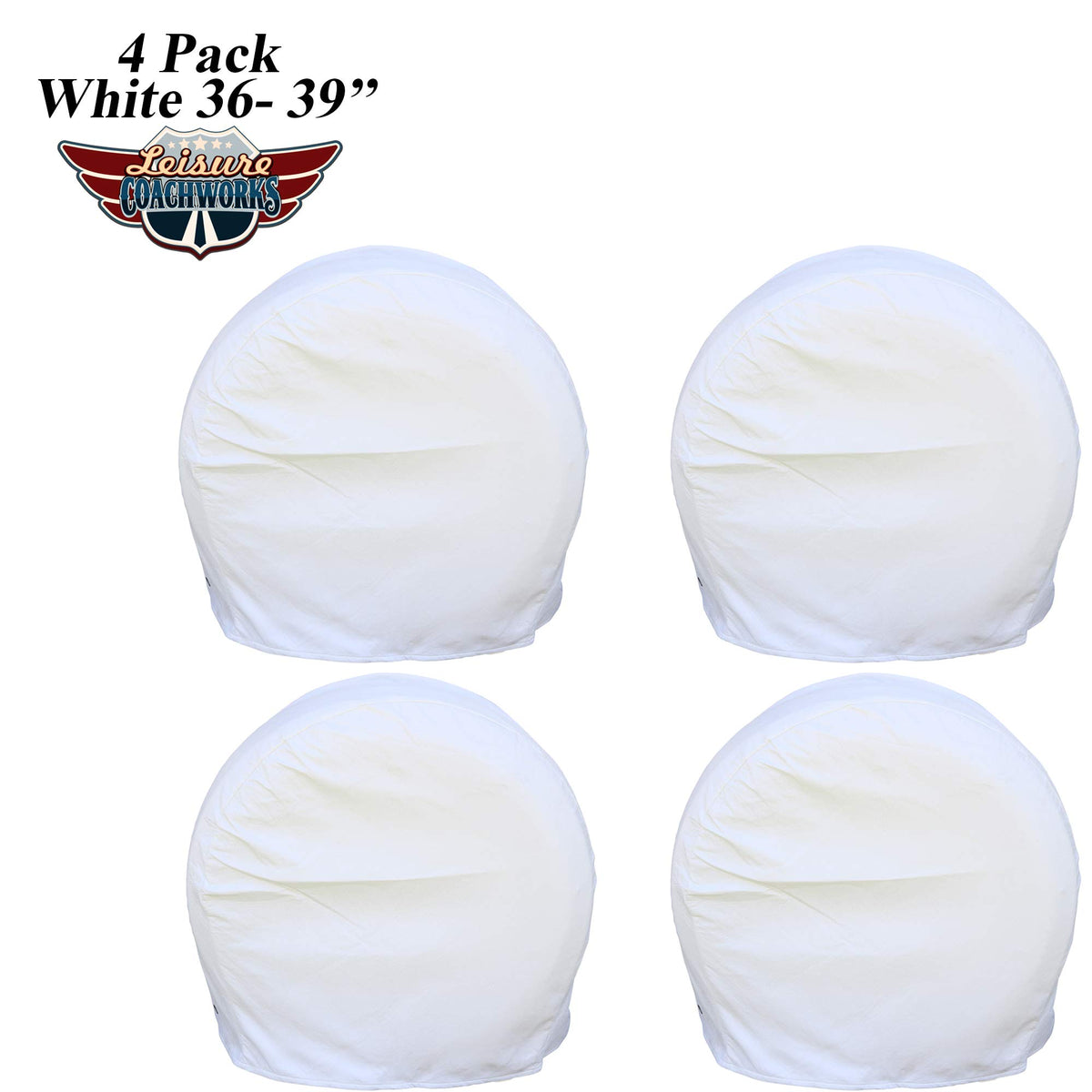 4 Pack Leisure Coachworks (TC 5W) Heavy Duty Vinyl Tire Covers 36-39'' Tire Diameter Product description: Fits 36'' to 39'''' diameter tires for RV,Trailer, Caravan, Camper,large lawn tractor tires, cars, trucks etc Wheel /tire covers are made of durable,soft vinyl with cotton backing, waterproof, resistant, protect the tires/wheels from sun, dirt, corrosion and all types of weather. With non-scratch soft backing, White, colorfast and easy slip-on design Eyelet with cord ensures more secure fit Package includes: 4 White RV wheel Covers