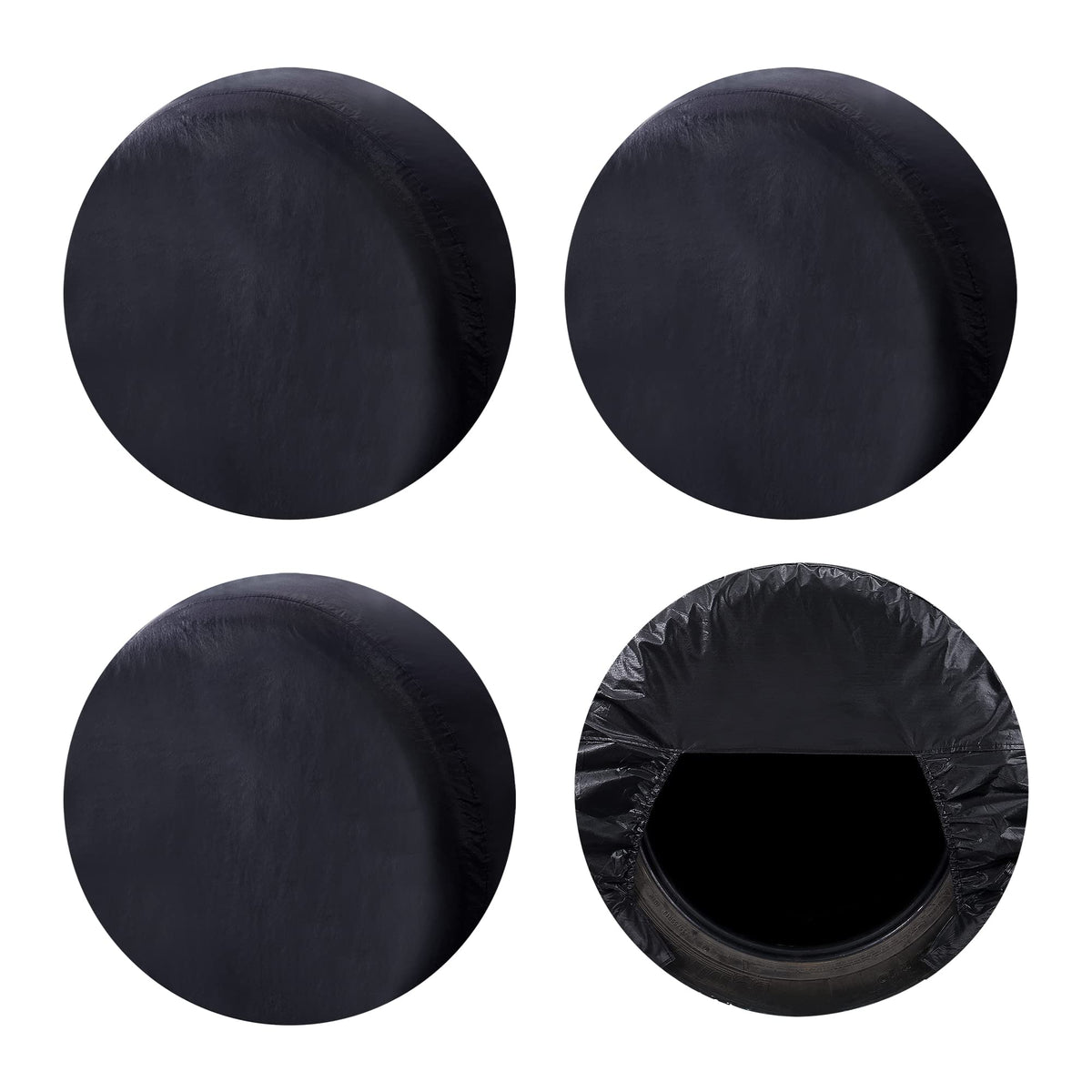 ?Included?Set of 4pcs wheel tire cover | ?Size Selection??Universal fit for 27 - 29 inch tire diameters (?? not the rim size).Please choose the suitable size of tire cover according to our size guide chart (or by calculate formula: For example your tire size marked is P225/75R15, A=225 B=75 C=15 Diameter=A*B/500/2.54+C=225*75/500/2.54+15=28.29 inch,then you should to choose the size M for Tire Diameter 27-29 inch.) | ?Function?It's a ideal all-season cover. Protects tires and wheels from sun damage, rust and dirt when your vehicle is parked. Durable water resistant coating with UV stabilized treatment, long-lasting and tough enough as a tire cover, And the tire cover is easy to clean, wipe only with clean water. | ?Compatability?Perfectly compatible for Jeep, car & truck, SUV, trailer, camper, motor home & RV, or anything with the correct tire size. | ?Unique Design?Elastic cord with auto-lock design easily makes a snug-fitting installation within seconds. Our design has remarkably raised the wind resistance capacity and we don't need ties or holes anymore to stay in high wind.