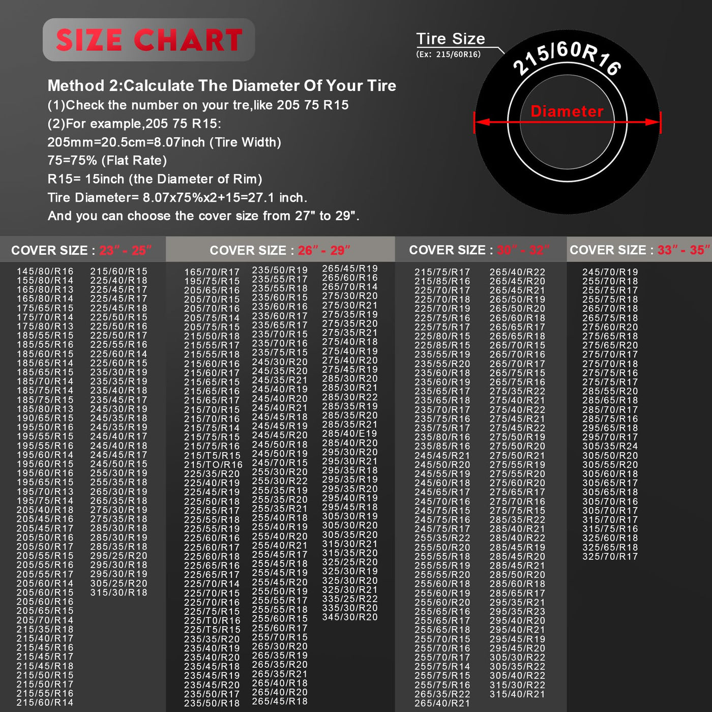 Features of 2 Packs RV Wheel Tire Covers: ?Heavy-Duty Material RV Tire Cover?Made of 600D PU Oxford, Comnova waterproof tire covers have better flexibility and tensile strength than Vinyl, Non-woven fabric, 600D Oxford. PU coating material will be more breathable and better to prevent rust. ?2 Packs 26''-29'' Tire Cover?Fits 26 - 29 tire diameters. Universal used on RV, 5th wheel, travel trailer, class a, class c, motorhome, jeep, camping, truck. **Note: if your tire diameter is just 29, it would be better to choose larger size (26''-29''). ?Tire Cover with Hook Design? Elasticized back hem and hook for you to keeps the tire protectors stay on the RV wheel securely even on windy days, it is easy to put on or remove. ?Functional RV Tire Covers?This RV tire covers can help prevent premature cracking of sidewalls that can lead to on-road blowouts, prolonging the lifespan of your tires, as well as protect the wheel and tire from dust, corrosion, dry rot, snow, ultraviolet and high temperature. ?Wind Resistant Tire Cover?Elasticized back hem and hook design for a secure fit. The cord keeps the tire cover stay on the wheel even on windy days. Easy to install and remove. Warm Prompt: 1.Please measure the distance across the center of the front of the tire from edge to edge. And then measure the depth of the tire itself. 2.Don't need to choose the bigger one, as the elasticized back hem & hook would provide you a custom fit and easy installation. covers tire wheel rv cover for trailer inch set of trailers camper travel tires syeral pack motorhome dual up trucks truck shade rvtire rvs rav pop motorhomes marine magne large hub heavy eluto duty corp camping campers bus boat