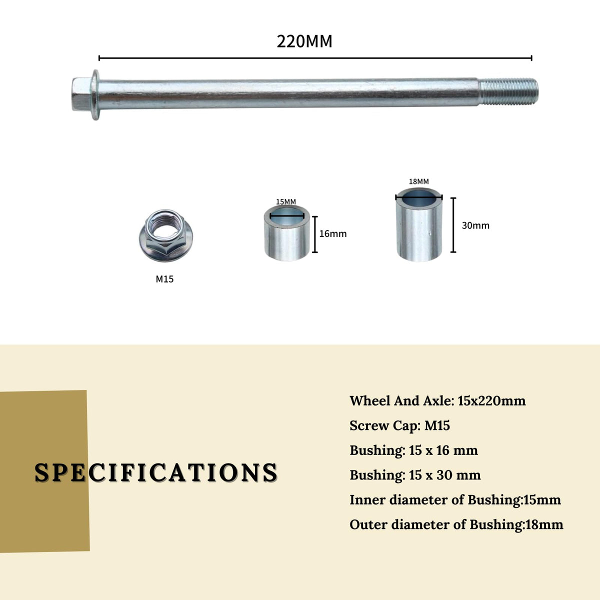 Q: What are the dimensions of the axle spacers?A: The axle spacers have a shaft diameter of approximately 15mm (0.59 inches) and a length of about 220mm (8.66 inches).