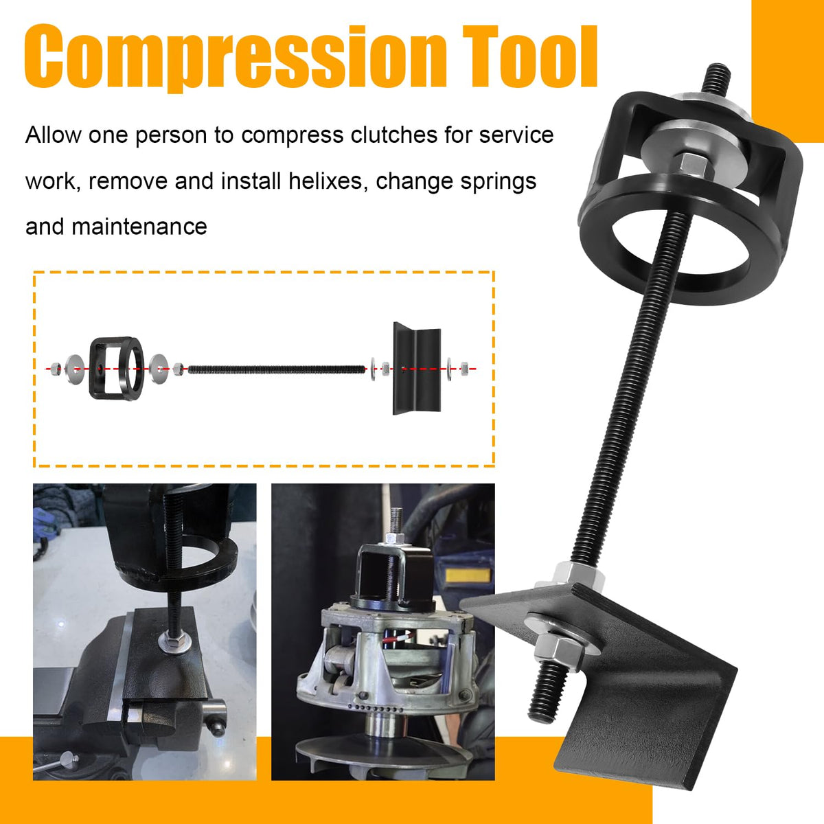 Q: What is included in the package of this tools kit?A: The package includes everything needed for clutch service: a primary clutch fixture plate with both straight fins and curved models, a primary clutch spider tool, a primary clutch spider lock nut tool, a primary and secondary clutch compression tool, and a 1/2 to 3/4 adapter.