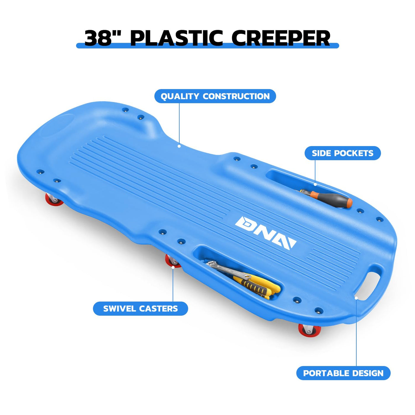38'' CAR CREEPER - One-piece, blow molded roller creeper and has a low-profile design making it comfortable to work. Ideal for sliding in and out from the automotive confined spaces. | ADVANCED DESIGN - Rugged ergonomics design with the impact resistant to provide extra comfort for users. Molded plastic deck is designed to fit shoulders and hips comfortably. | WORK EASIER - Designed with 6pcs 360-degree swivel casters which deliver smooth and precise movements around your garage, making work routine take less time. Has side pockets for holding tools & bolts. | ROLLING GARAGE SHOP CREEPER - A perfect portable creeper for the automotive engineers. Built-in carry handles for easy carry, storage. The lightweight construction makes it easy to carry. | HIGH-QUALITY DNA TOOLS - Each item in our collection is the result of significant research and development, as well as rigorous automotive application testing and fitments carried out by our highly qualified specialists. We test the material's strength and durability to guarantee that the tools arrive completely prepared for their intended use at the consumer's end.